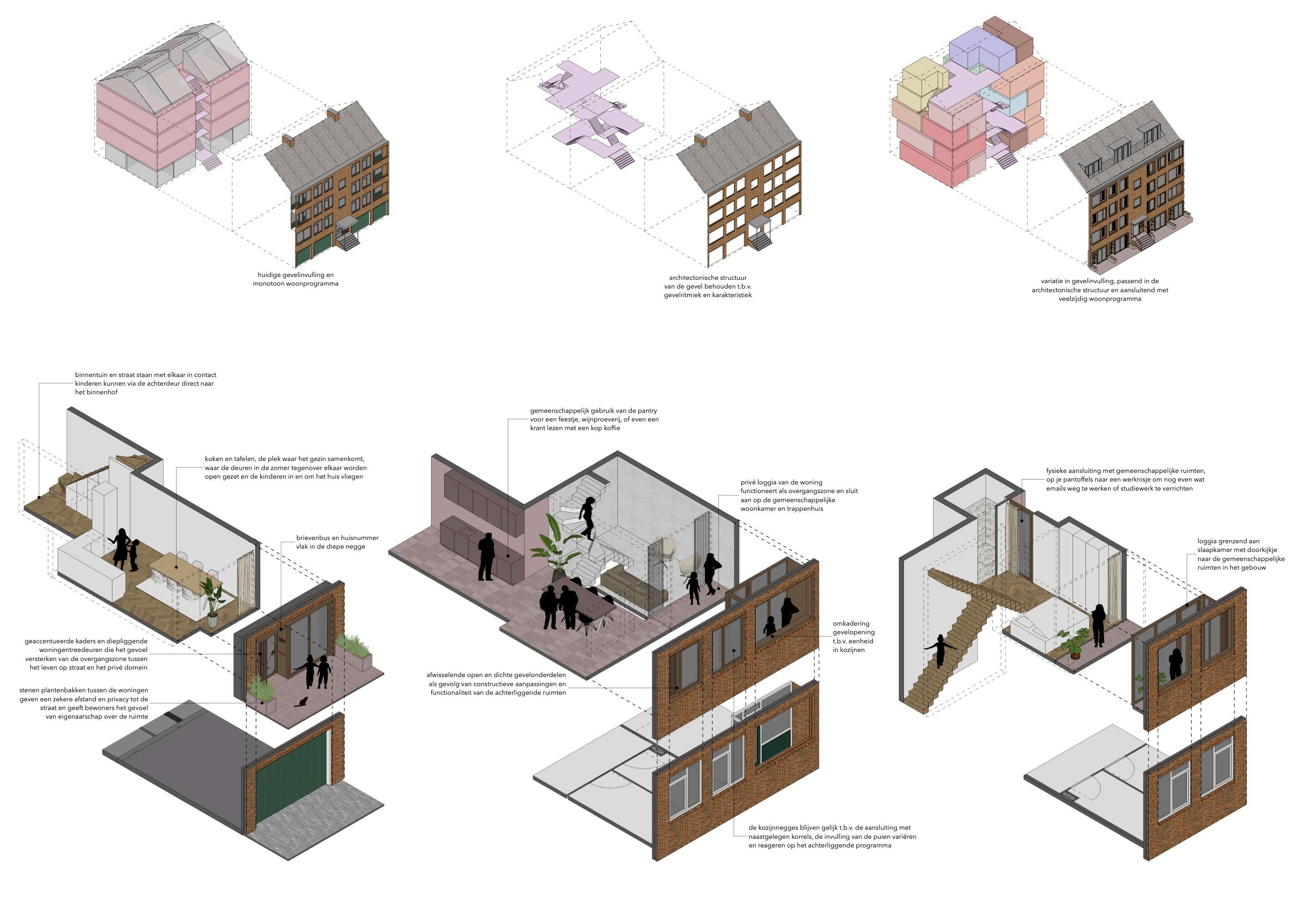 Door één korrel uit het blok te transformeren en de aansluiting tussen gebouw, bewoner en het leven op straat te activeren, verandert de monotone kastelenstraat in een levendige ontmoetingsstraat.
