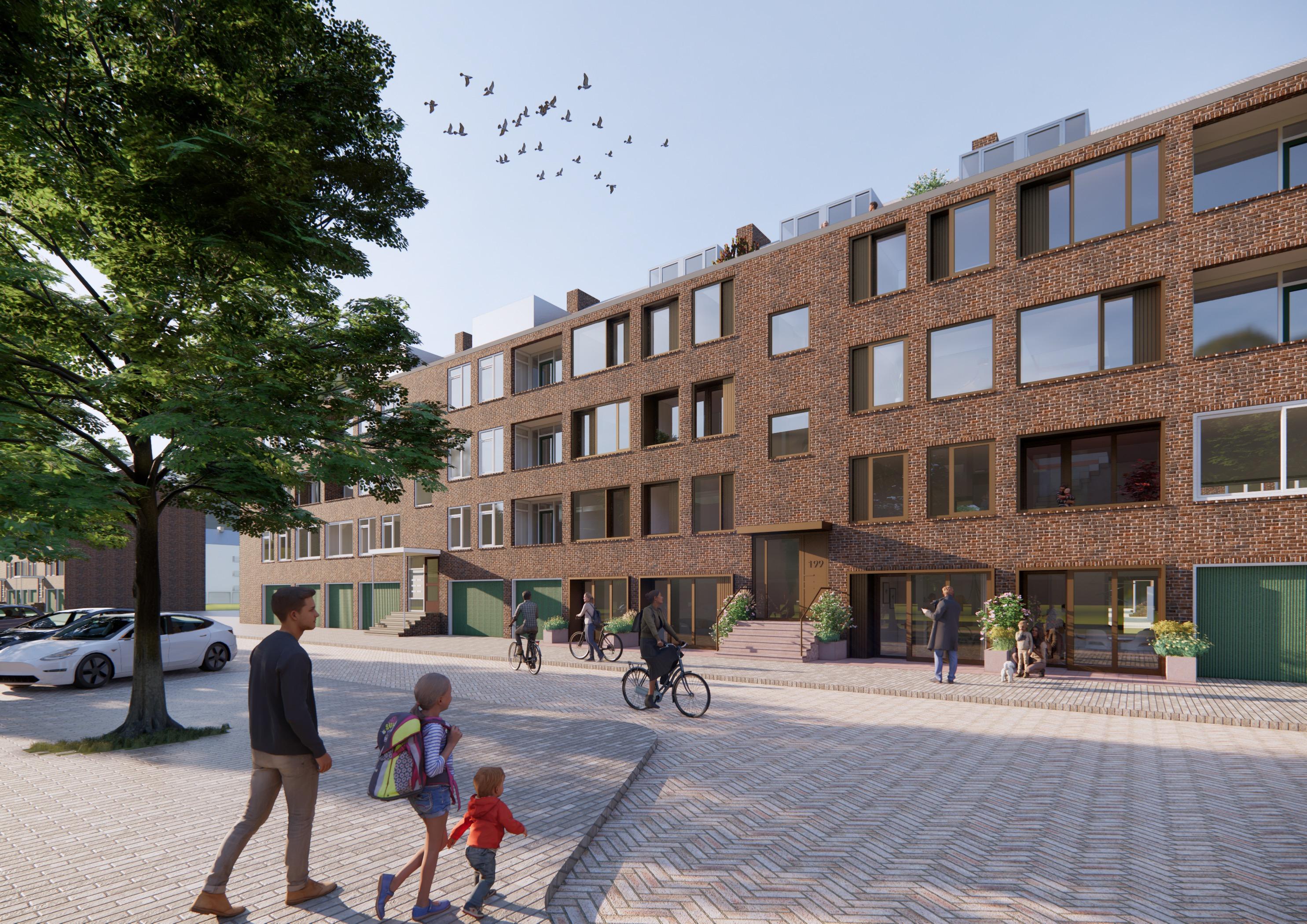 De levendige plinten met woonprogramma zijn de verbinders met de straat en het binnenhof en dragen bij aan het versterken van een sociale buurtgemeenschap.