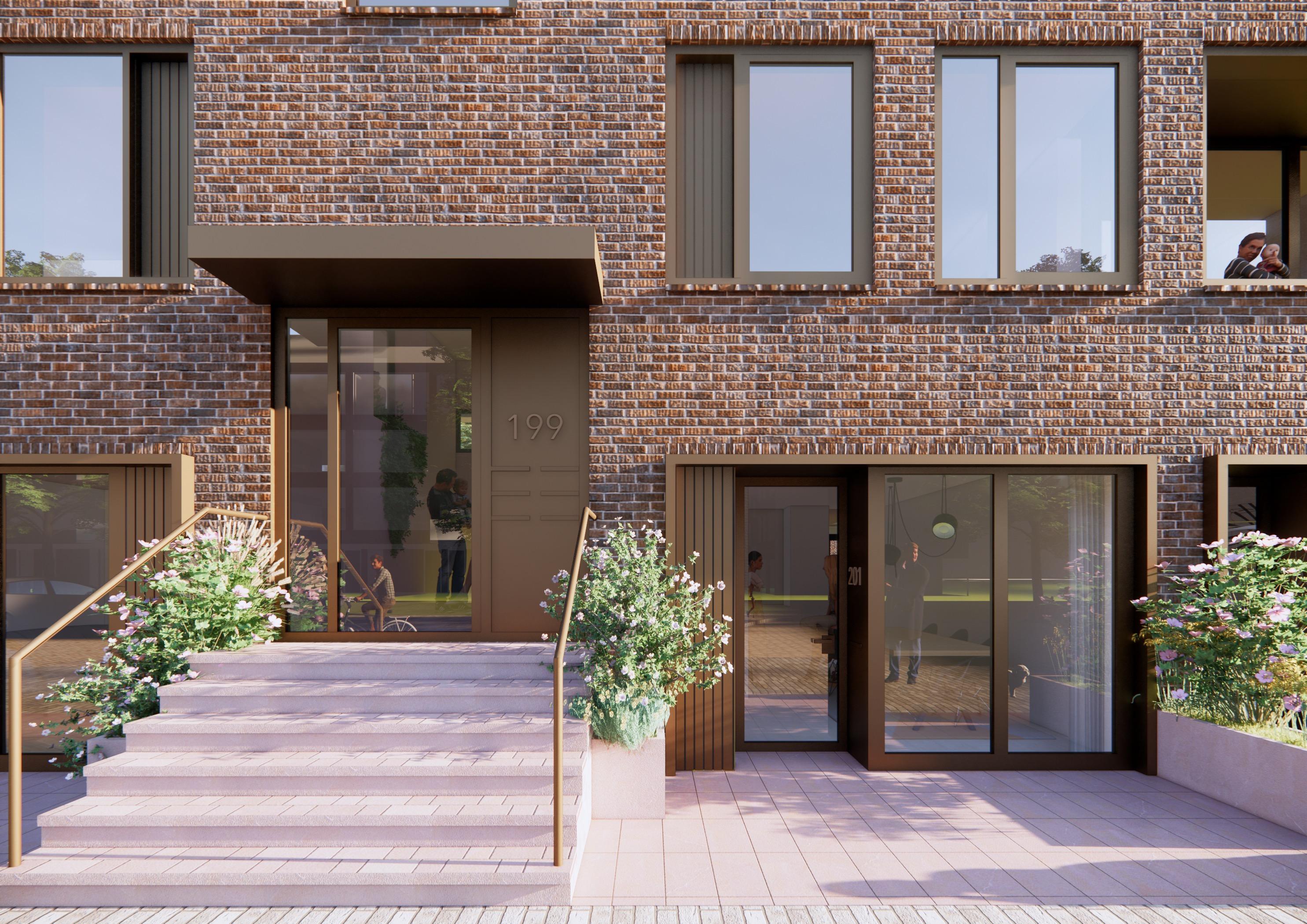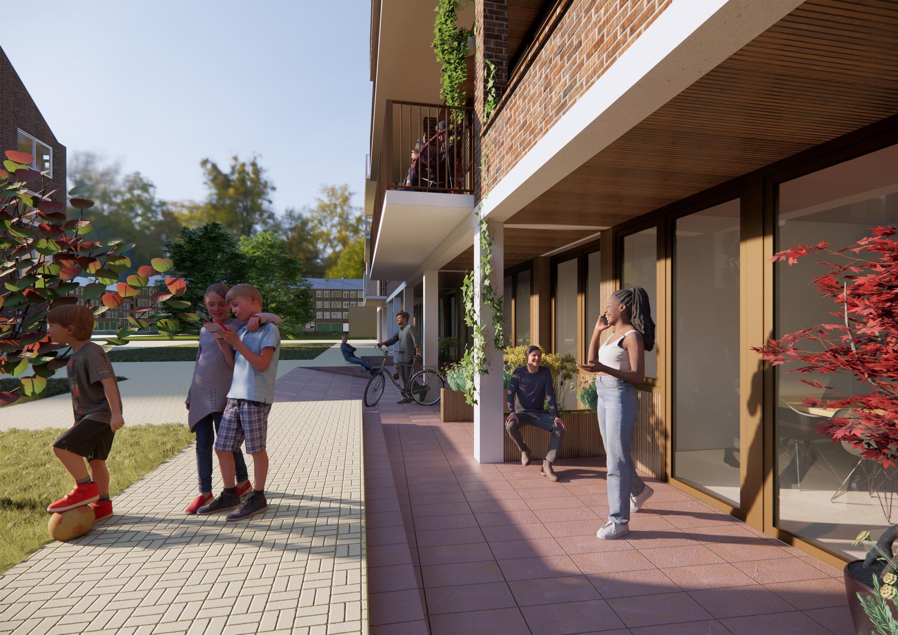 Kenmerkende portieken activeren tot kwalitatieve gedeelde ruimte, die uitnodigt tot het maken van een praatje, waar het thuiskomen begint