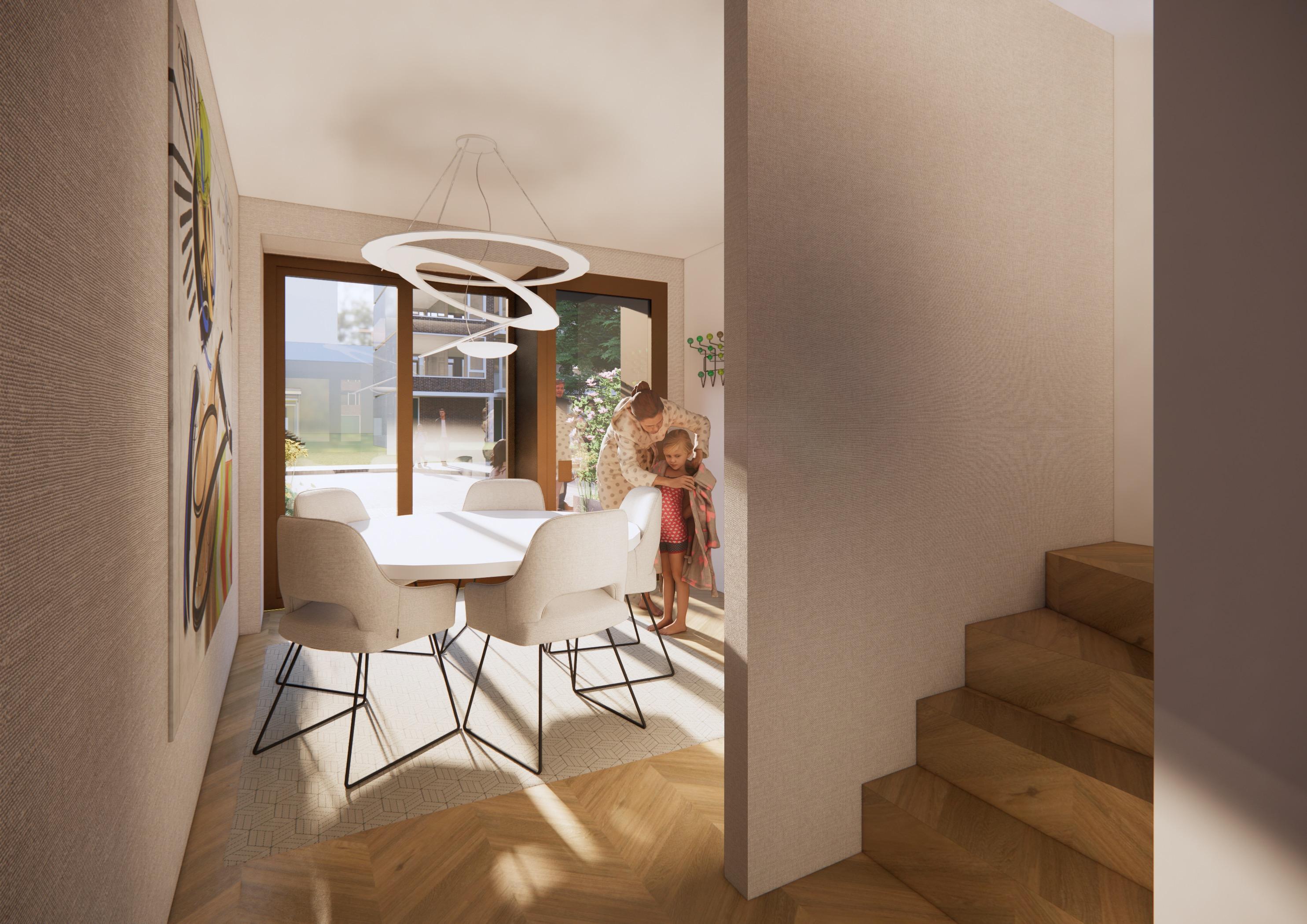 Het entreegebied is de verbinder tussen straat en binnentuin. Hier begint het thuiskomen. Geen donker trappenhuis waar je direct de voordeur achter je dichttrekt, maar een gemeenschappelijk gebied waar toevallige en laagdrempelige ontmoetingen plaatsvinden. Even de post ophalen, ruimte voor een praatje, spelende kinderen op de brede trap naar de binnentuin.