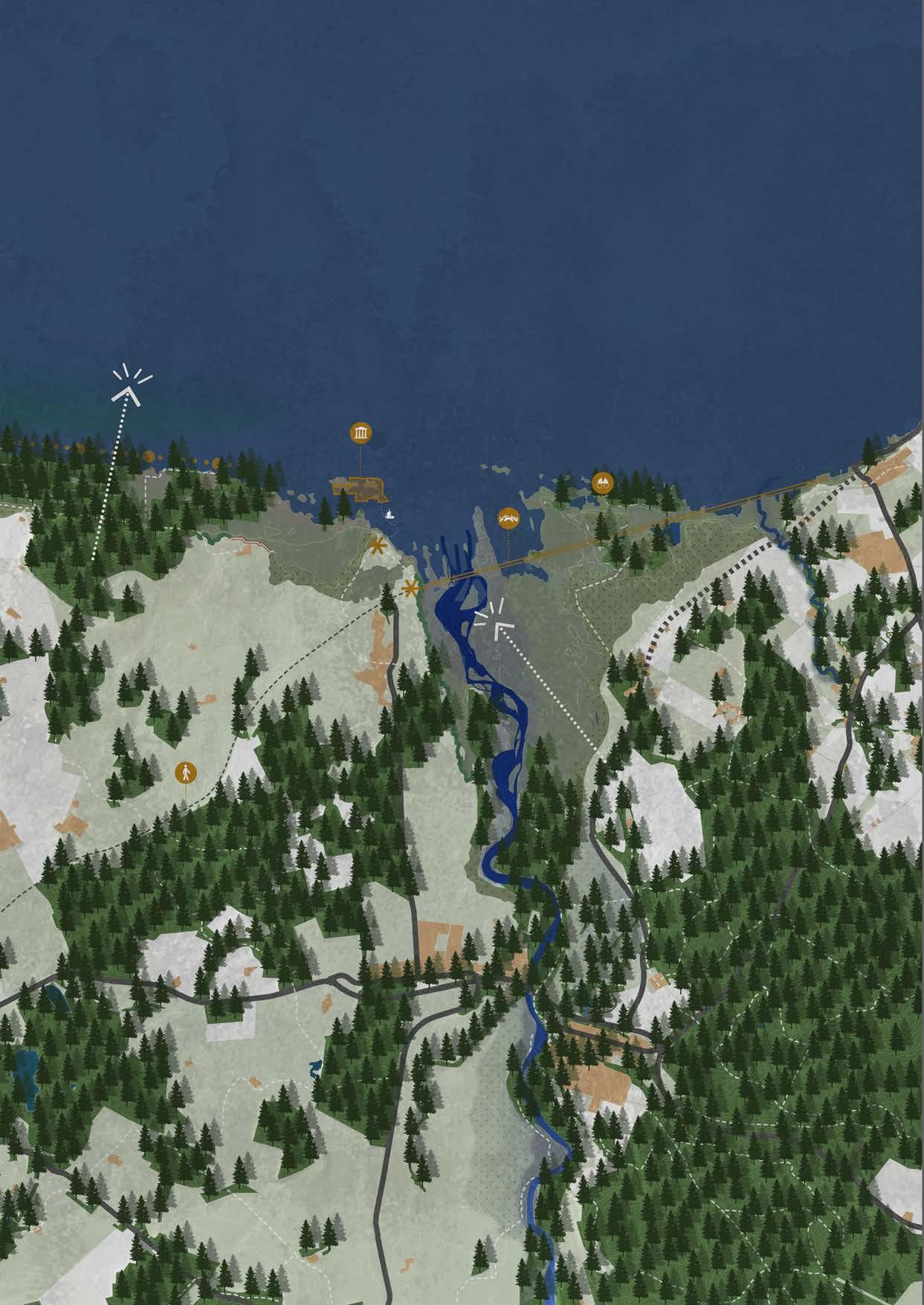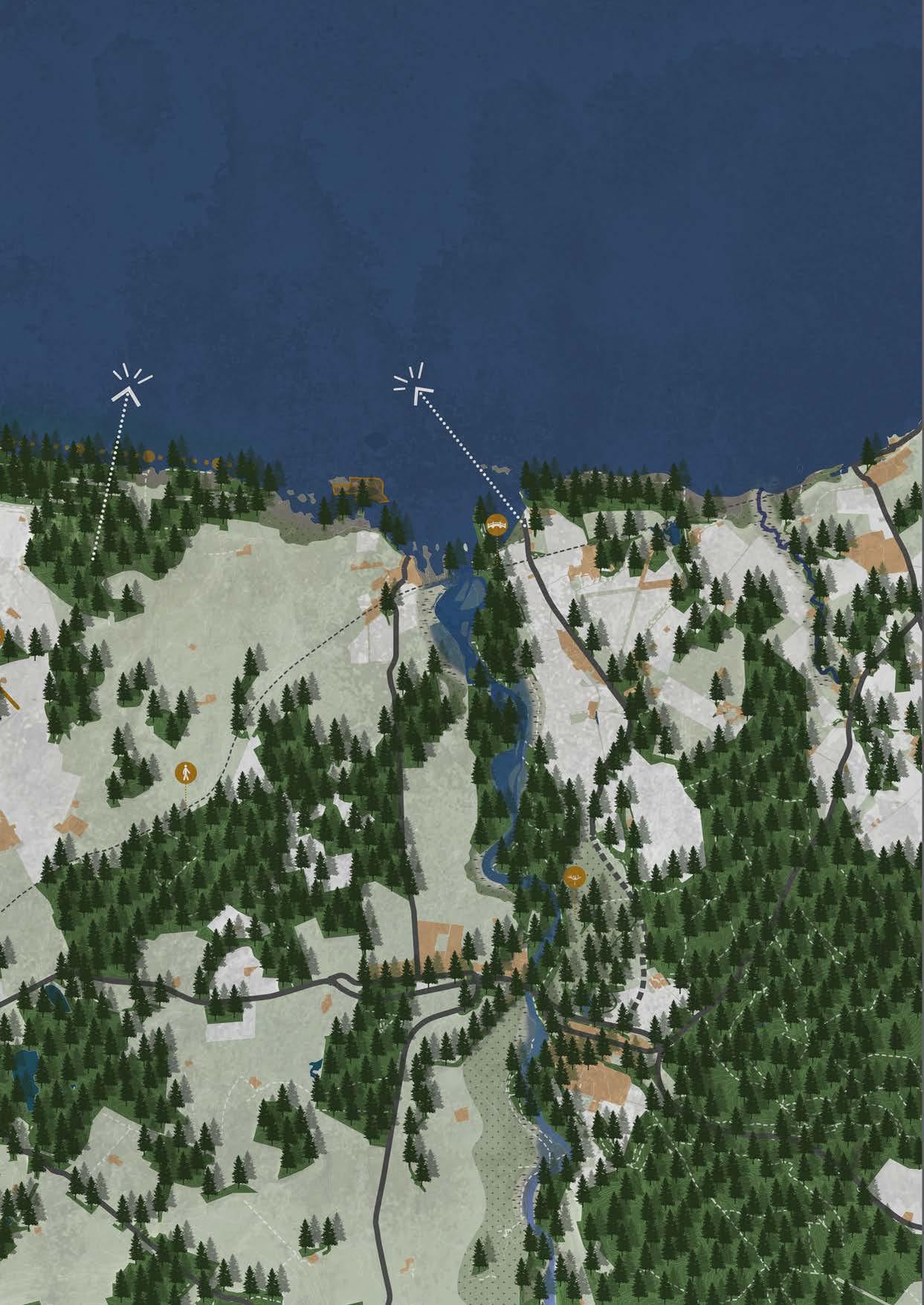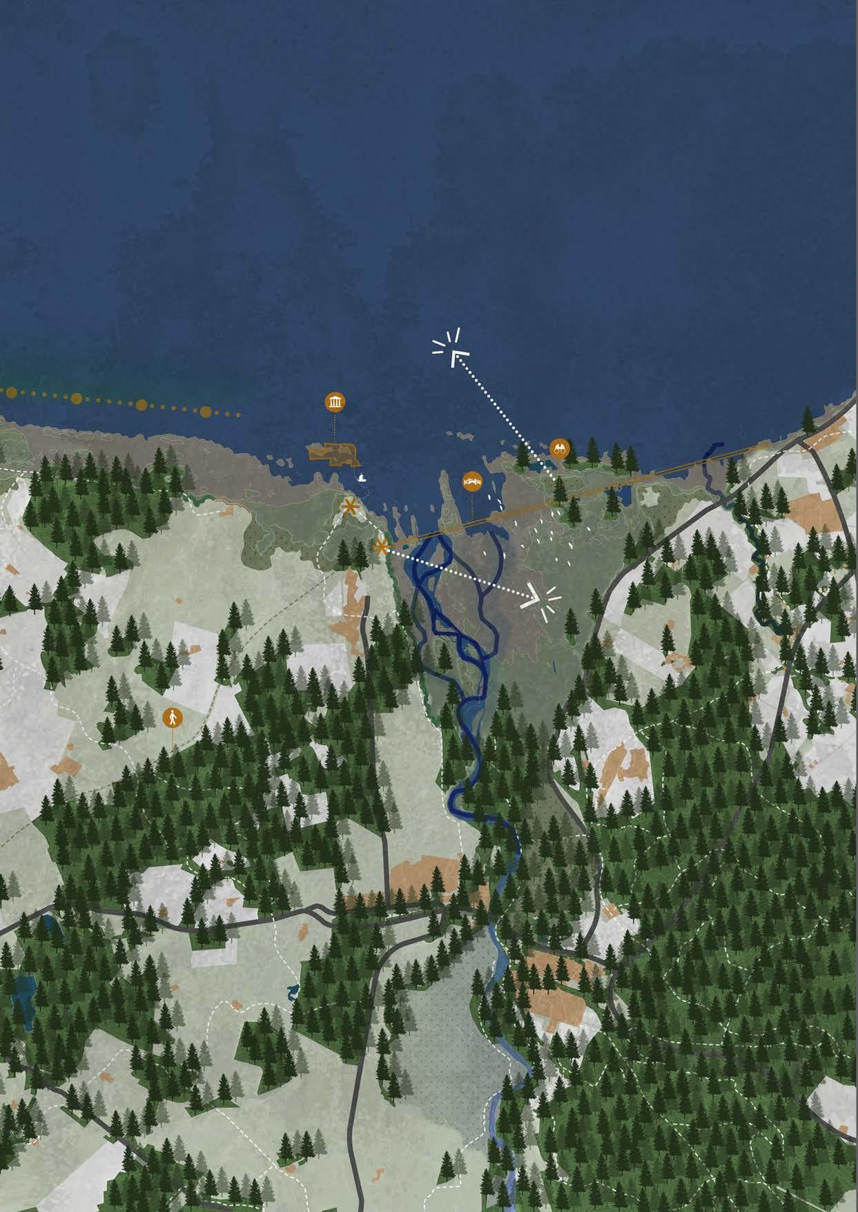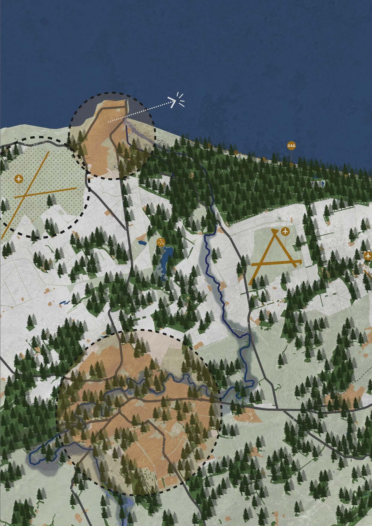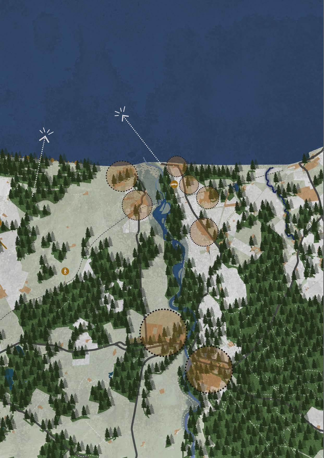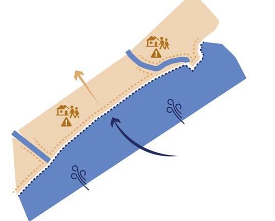 nu opnieuw aan de rivier, maar dan bovenop de cliff. Zo behoudt Garmouth, net als voorheen, de sterke connectie met zowel het water als het achterliggende land. Aan de westzijde van het dorp bevindt zich een gefaseerd gebied voor tijdelijke woningbouw, bedoeld voor bewoners uit de omgeving die door erosie moeten verhuizen.