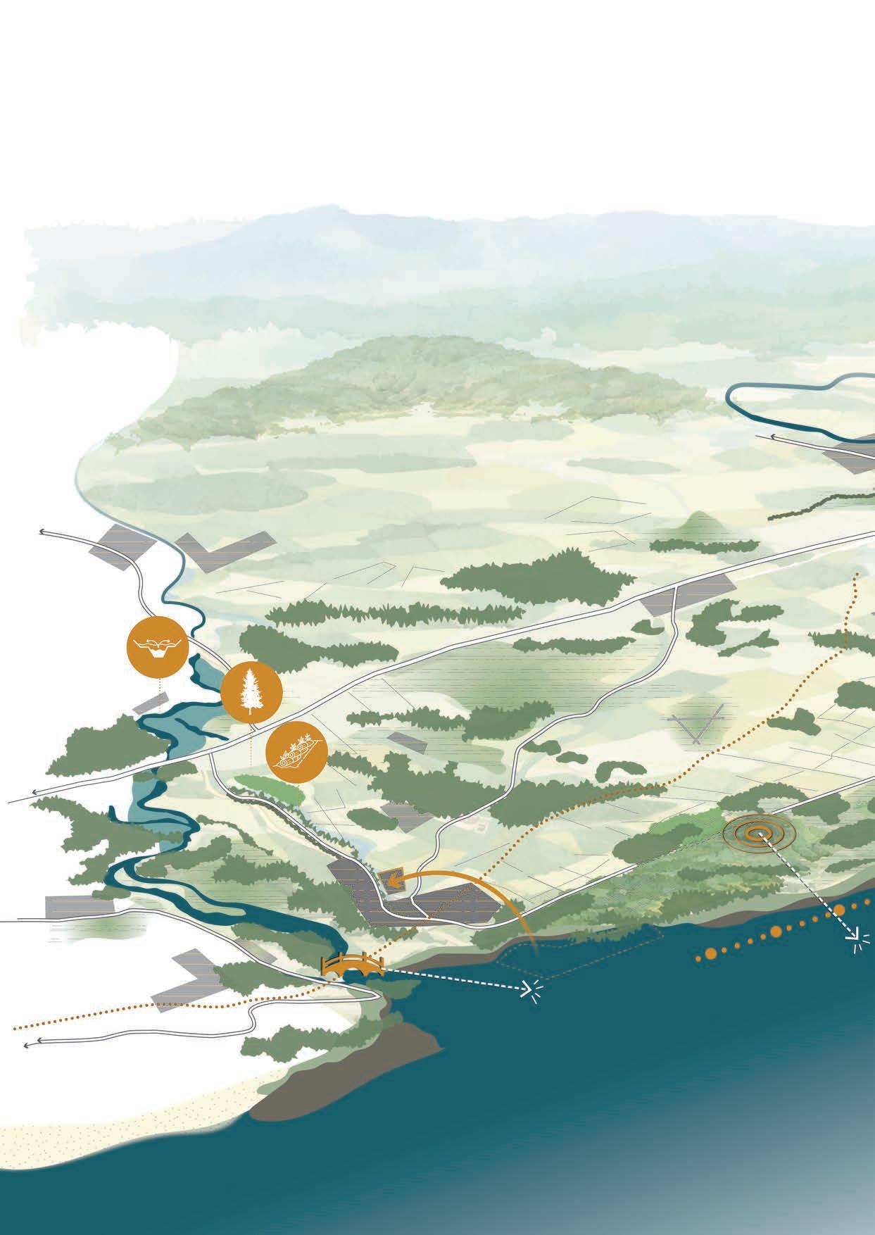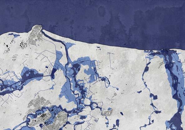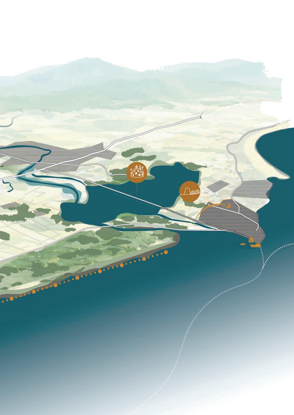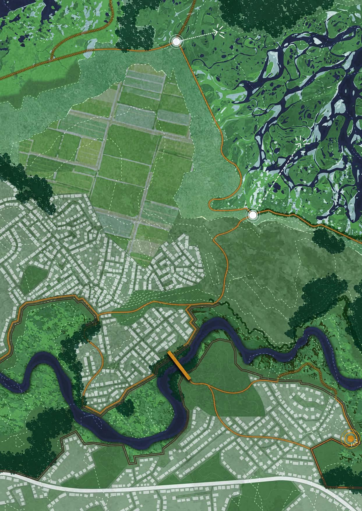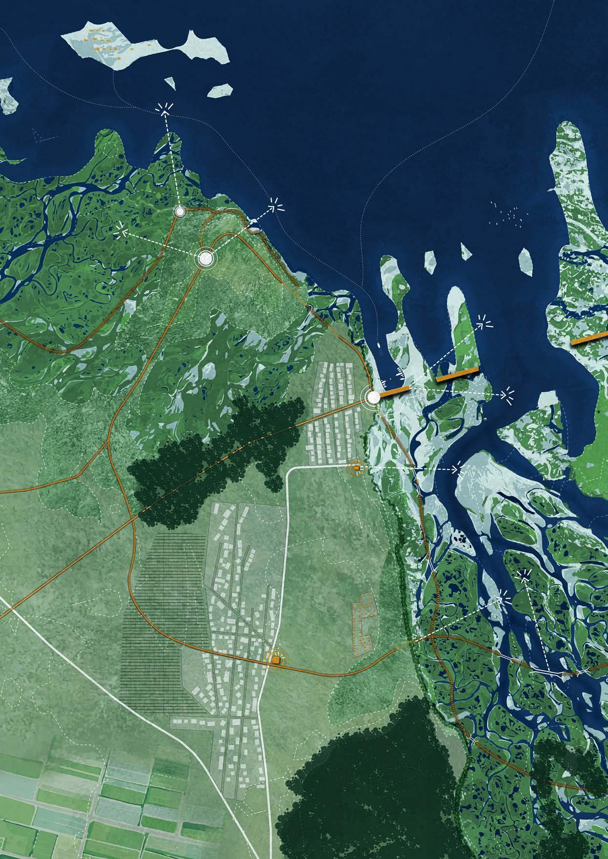 Rondom de stad zijn nieuwe landbouwgebieden ingericht. Deze lagen voorheen op de plek waar nu de delta en estuaria zijn ontstaan, waardoor landbouw en riviersysteem elk hun eigen plek hebben gekregen.