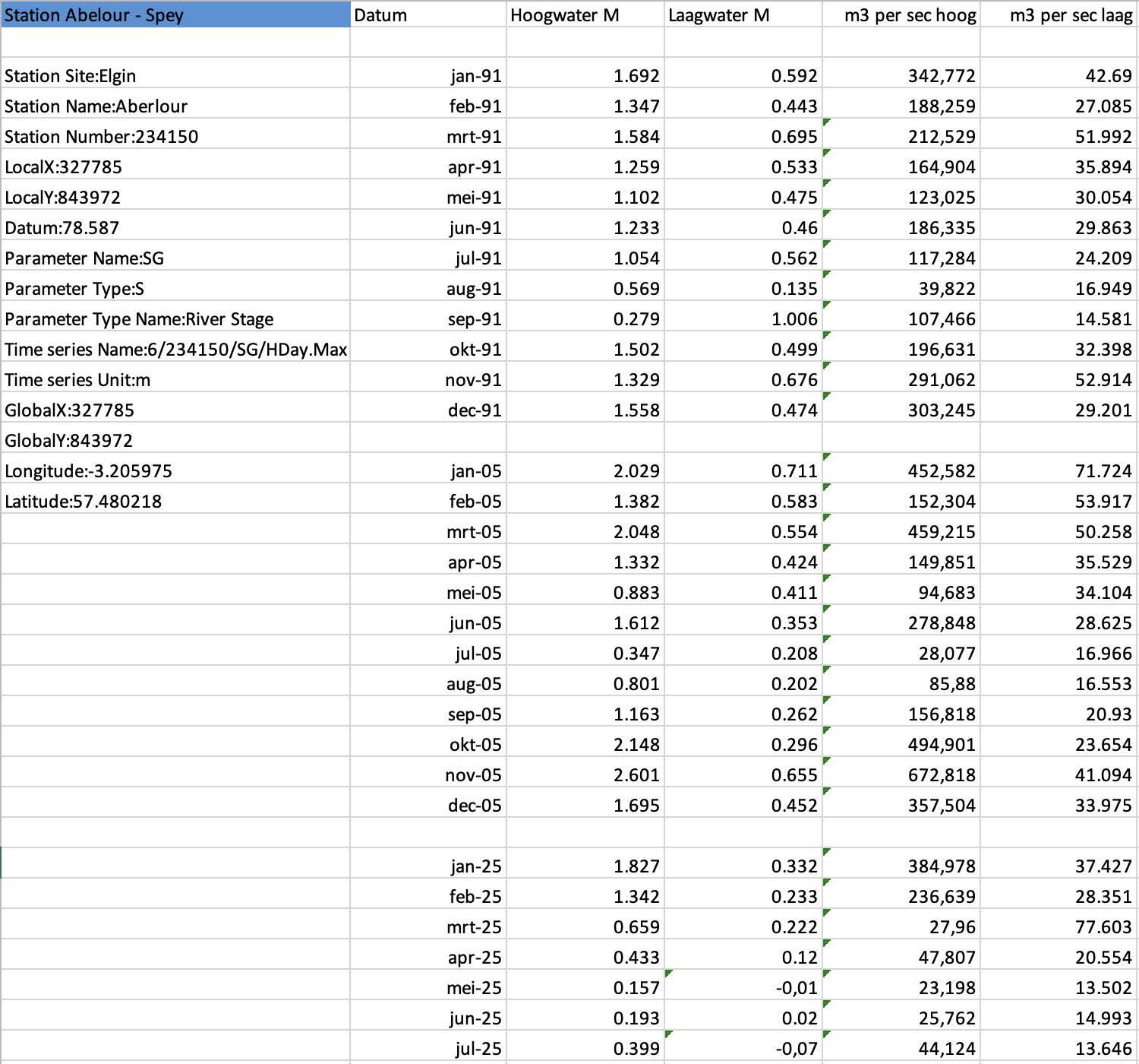 Scottish Environment Protection Agency. (z.d.). Water level information – Spey at Aberlour (Station 234150). Geraadpleegd op 8 november 2025, van