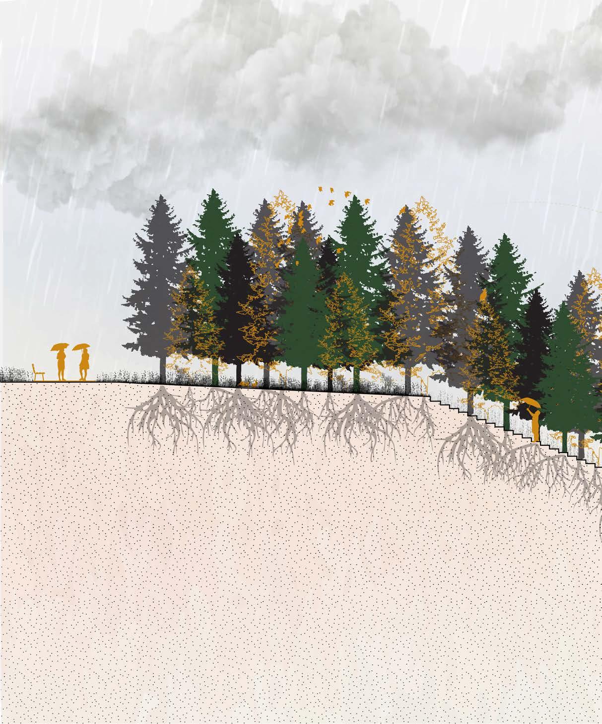 Doordat de wandelpaden verbonden zijn met alle lagen van het landschap en zorgvuldig zijn ingepast in zowel de zachte als harde maatregelen, zoals trappen over en door de krainerwand, wordt het landschap zichtbaar, voelbaar en beleefbaar. Zo ontstaat een veilige balans tussen mens en natuur.