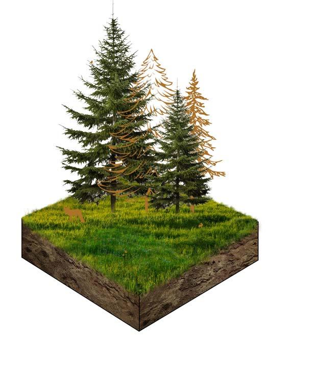 Ondergronds gaan de wortels van naaldbomen een functionele samenwerking aan met schimmels, bekend als mycorrhiza. Binnen dit netwerk worden voedingsstoffen en water uitgewisseld, wat de opnamecapaciteit van de bomen vergroot en hun groei bevordert. Bovengronds zorgt de jaarlijkse afzet van naalden voor een dikke strooisellaag die langzaam afbreekt en de bodem verder verzuurt. Hierdoor ontstaat een karakteristieke bosbodem waarin mossen, varens, bosbessen, korstmossen en slechts een beperkt aantal kruidachtige soorten voorkomen.