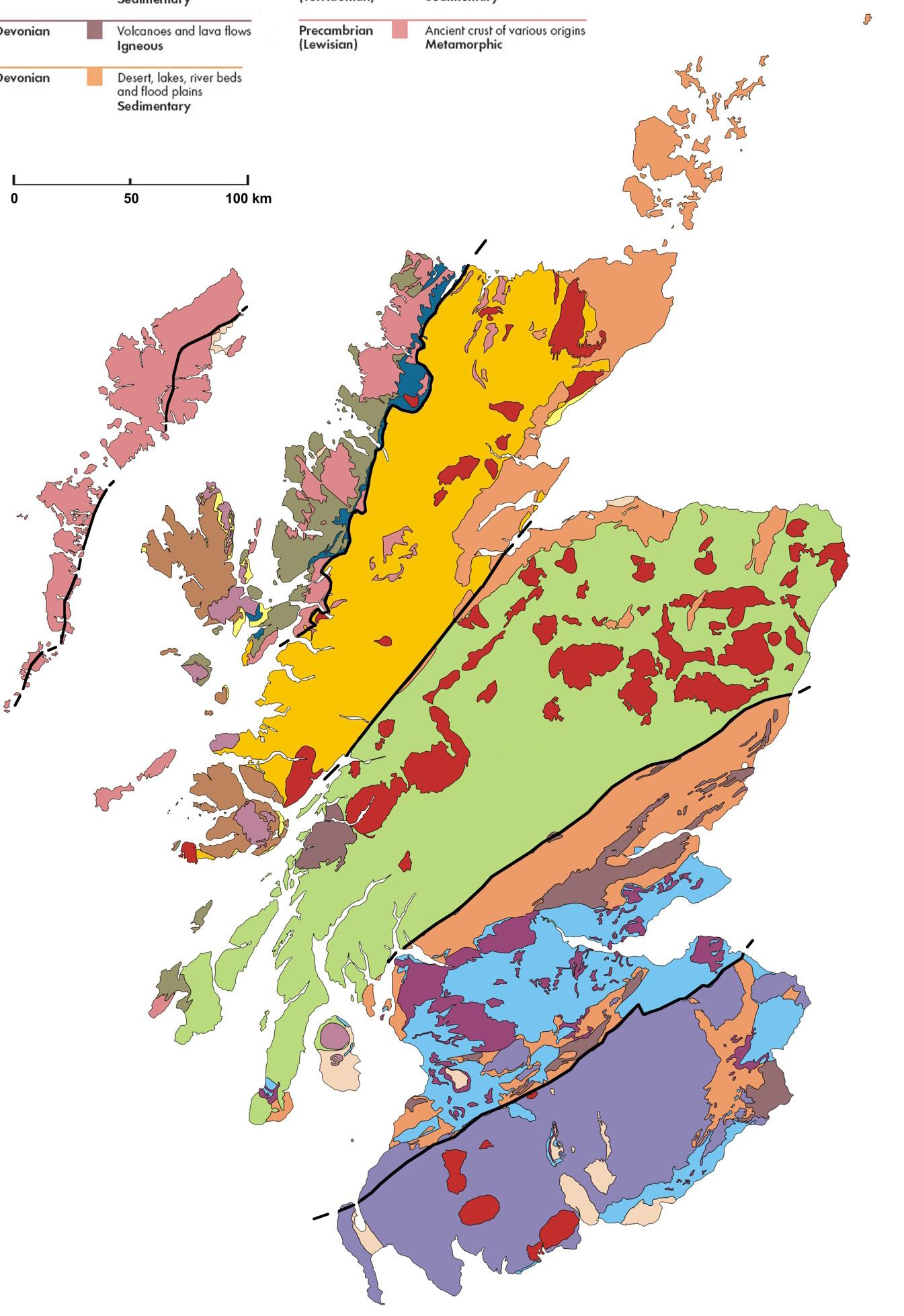 Devonian Woestijn, meren, rivierbeddingen en overstromingsvlakten, Sedimentair Precambrian (Dalradian) Oorspronkelijk ondiepe en diepe oceaanbodem, daarna diep in de aardkost, Metamorf