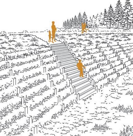 Langs enkele wandelroutes worden trappen aangelegd om hoogteverschillen te overbruggen. Deze trappen worden zo eenvoudig en natuurlijk mogelijk uitgevoerd met houten piketten en stammen uit de omgeving. Door variatie in lengte, diameter, ontstaat er een vormgeving, waarbij de traptreden zich aanpassen aan het terrein.