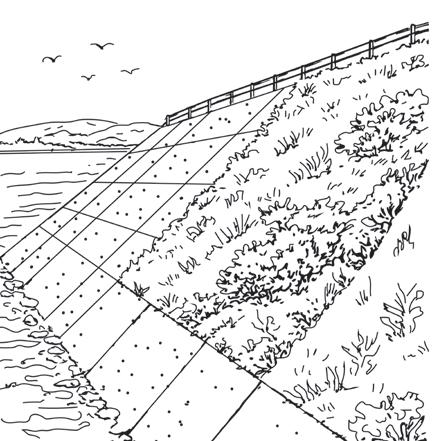 Langs de cliffen zijn verschillende vegetatiewanden toegepast, waaronder betonnen wanden met vegetatieroosters en krainerwanden. Deze ingrepen stabiliseren het landschap en dragen tegelijkertijd bij aan een natuurlijke uitstraling. De recreatieve laag is afgestemd op de ligging van de dorpen en de verschillende hotspots in het gebied. Wandelpaden lopen door de delta, langs de zee in het slikken- en schorrengebied, over de hogere graslanden en langs de randen van de cliffen.