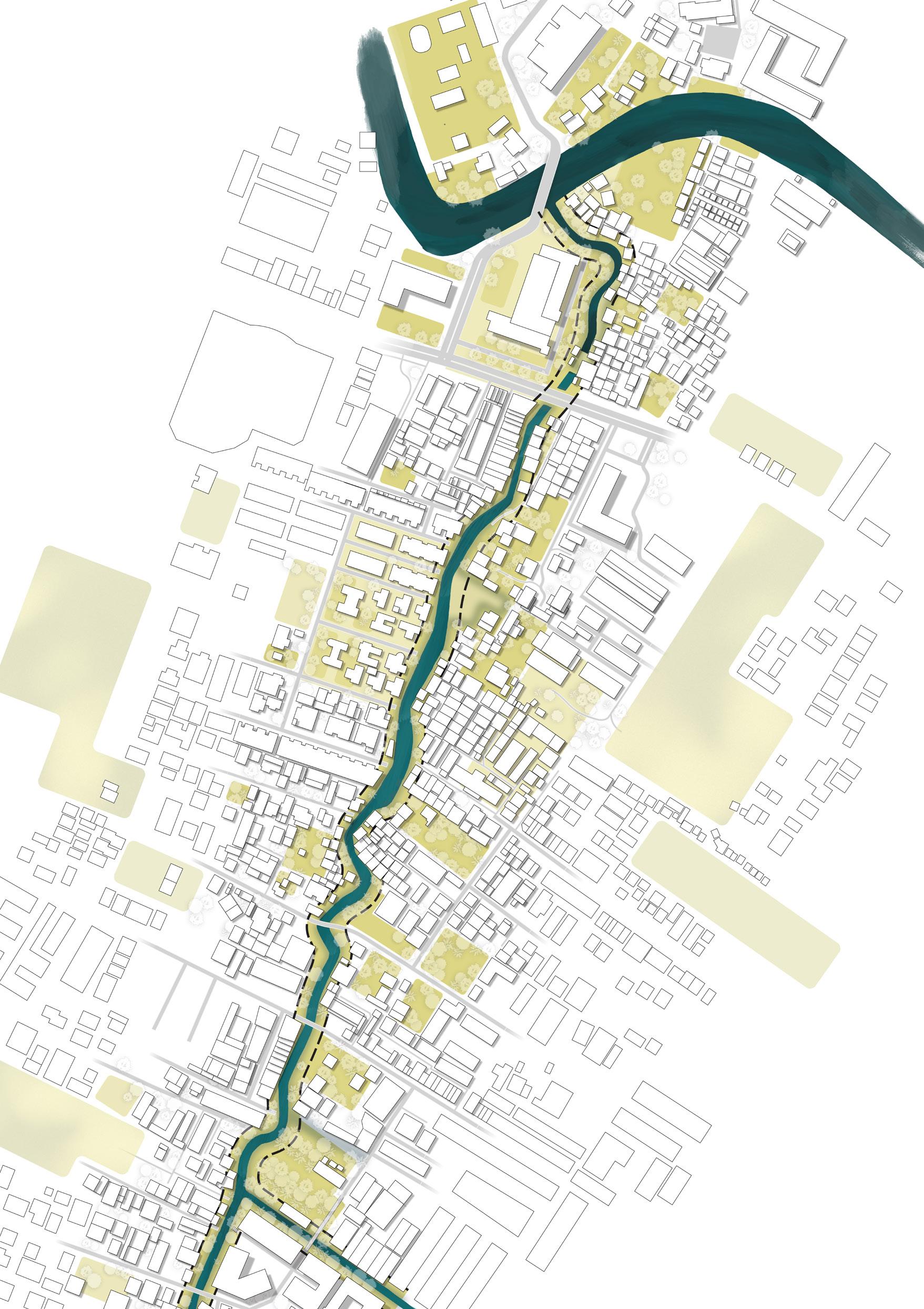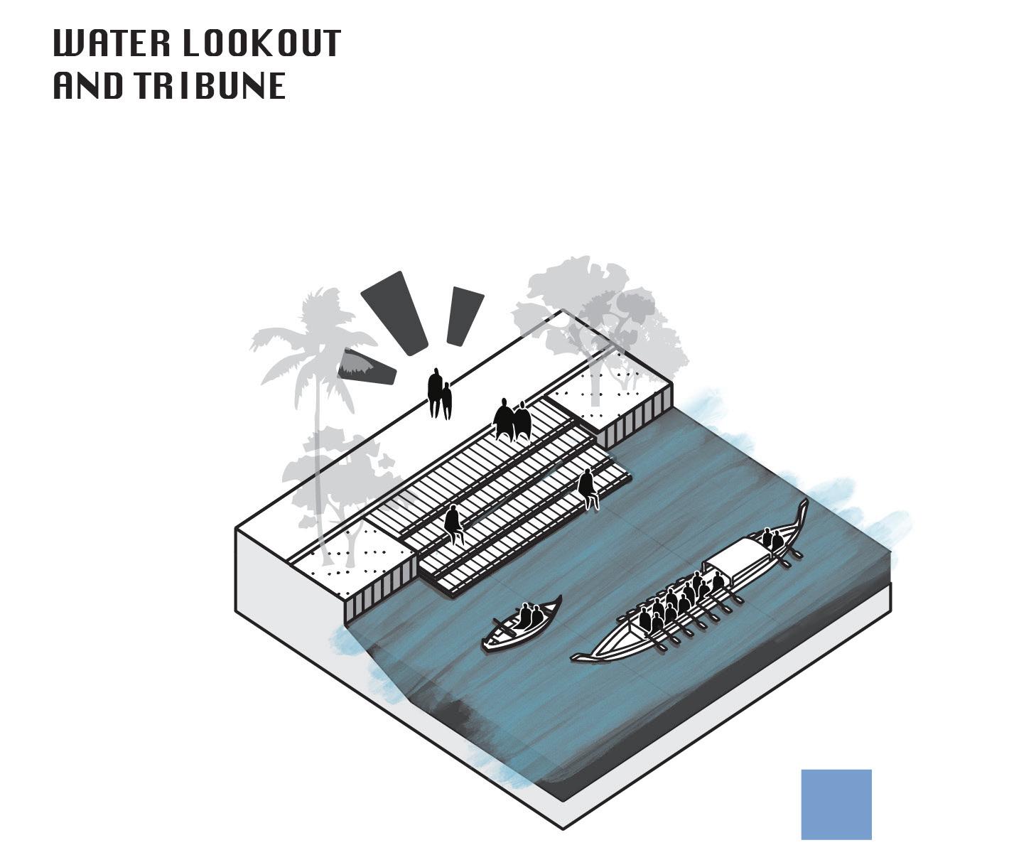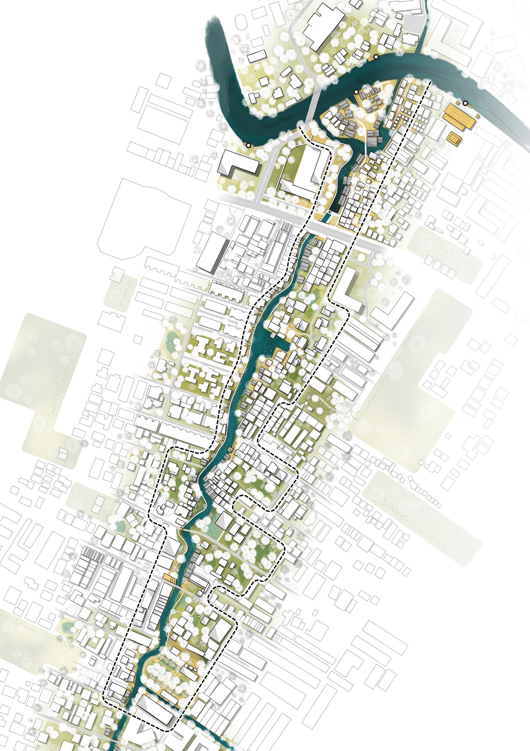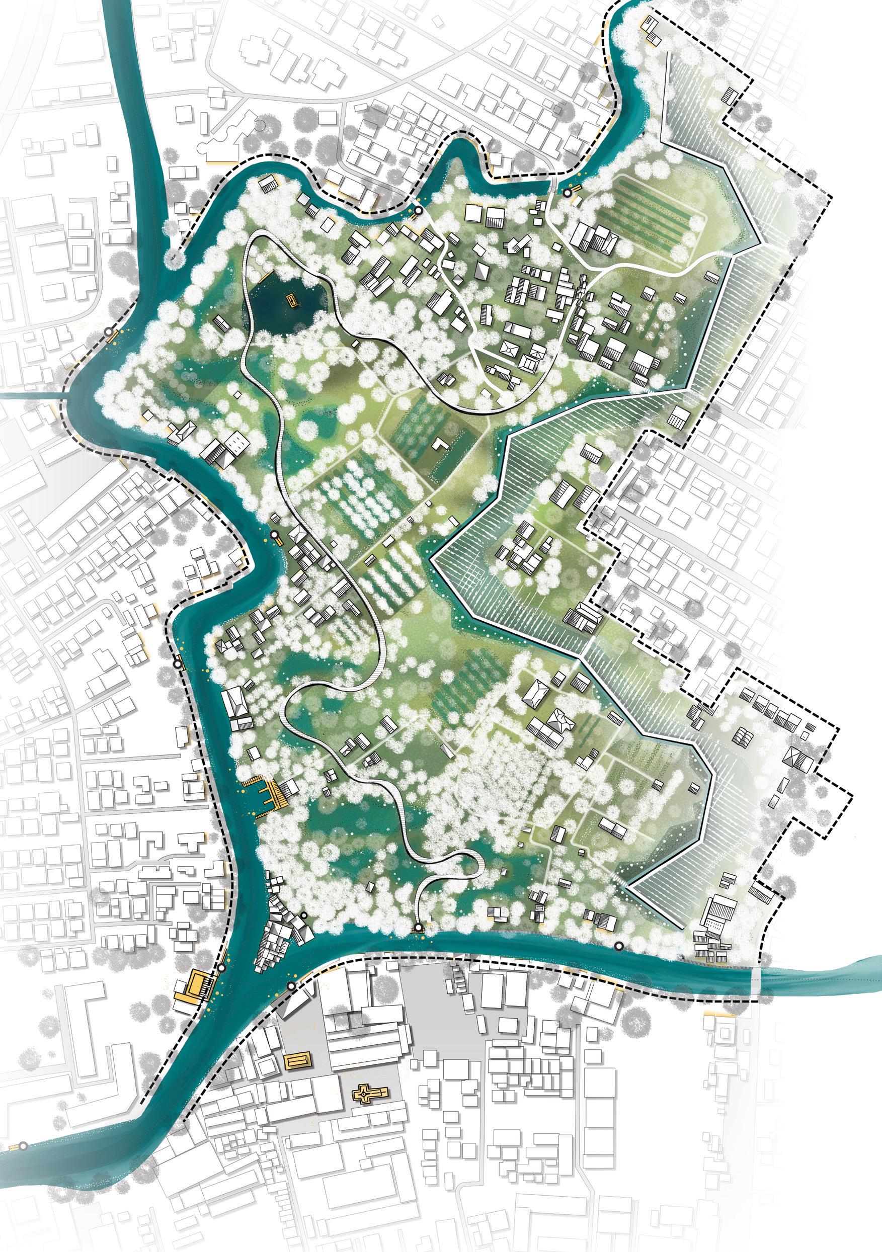 Floodable banks and multifunctional platforms allow the water’s rhythm to shape daily life, where a floating market nearby the pumping station brings back vibrancy, offering a place to eat, trade, and meet. Here, water reconnects rather than separates, stitching together the city’s fragmented edges.