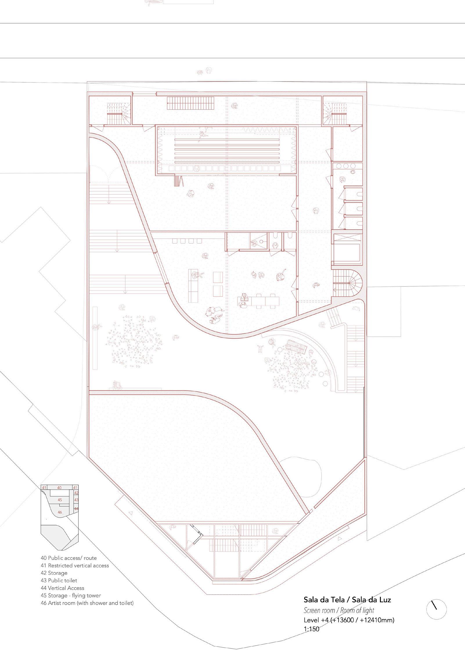 and exhibition spaces. With the new interventions, the building becomes part of the urban fabric. The inner space is divided by a street, the Candelaria alleyway that serves as a link between the city and the 2 main spaces; Sala da Tela (Screen Room) and Sala da Luz (Room of Light). These spaces are created from the remains of the flm projection room and the screen of the old cinema.