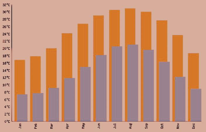 The metropolitan area of Tel Aviv has a Mediterranean climate, characterized by a long dry season, hot summers, and rainy winters. In summer the temperature in Hod HaSharon is more than 30 degrees Celsius, and between 15 and 20 degrees Celsius in the winter. From March until November it is usually very warm and dry. In the cities especially, the temperatures rise because the paved surfaces between the concrete buildings absorb the sun and create heat islands. Because of climate change and global warming it will be even warmer in the future. Not only has the number of warm