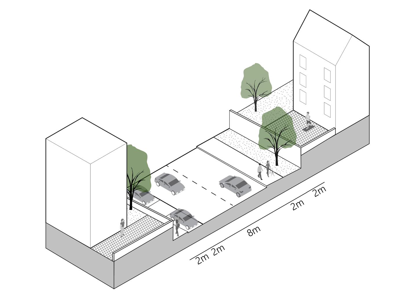 road is a bio-swale for pre-treatment of polluted runoff. The new street profile has more space for trees and vegetations that are relatively high in maintenance. They can survive a warm climate and long periods of drought. The street has a ‘cultural’ atmosphere.
