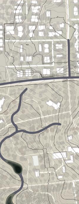 ing bridge that hovers above the ditches and passes high between the trees. From the bridge the water system is visible and visitors can see various perspectives of the forest. At the highest point of my design the walking bridge ends. Here a watching tower is built that is reminiscent of the water towers that once existed in the area. Furthermore, in the upper stream area I provide spaces for new urban development that is characterized by a low density with tiny houses that are spread across the forest.