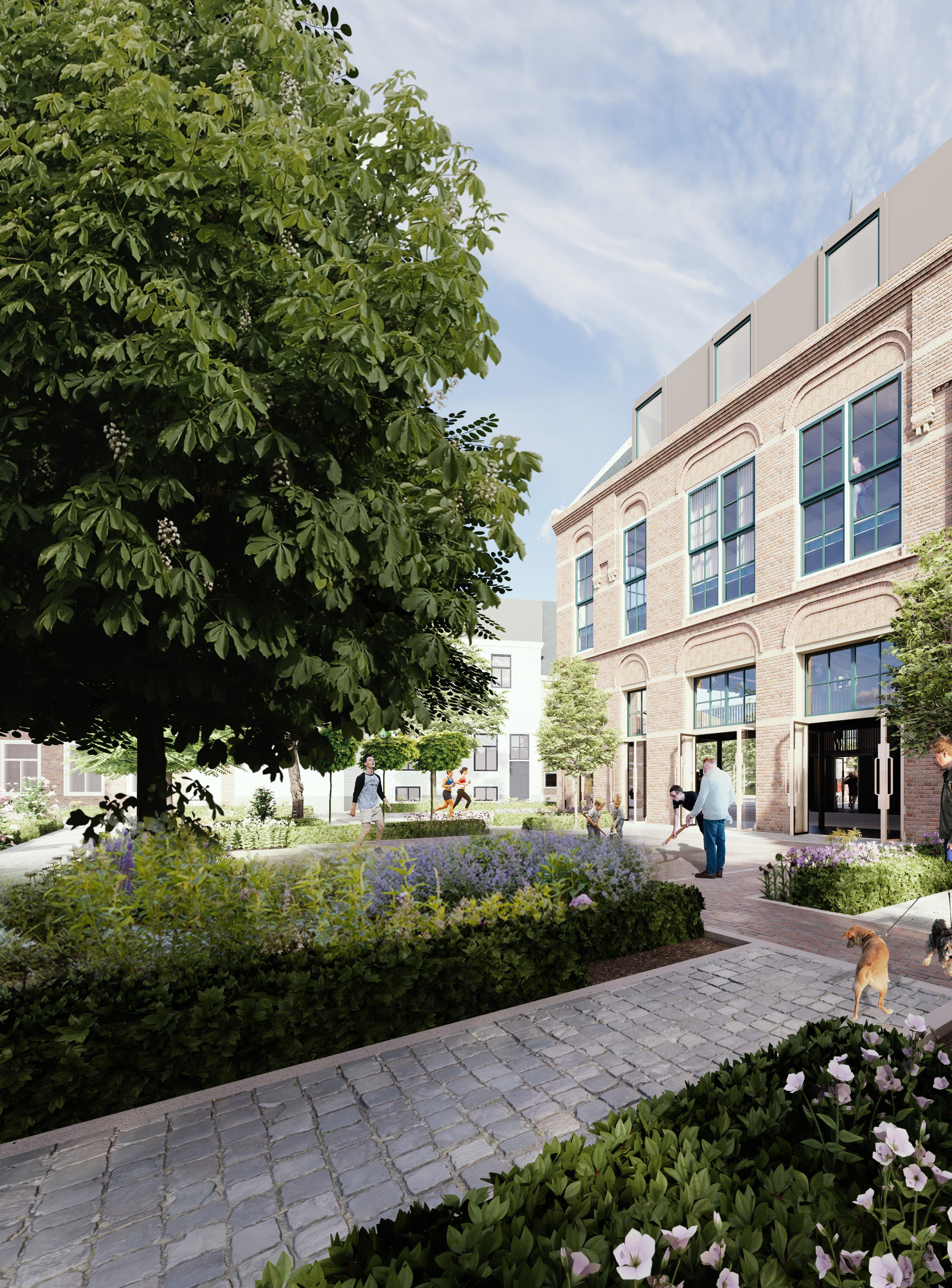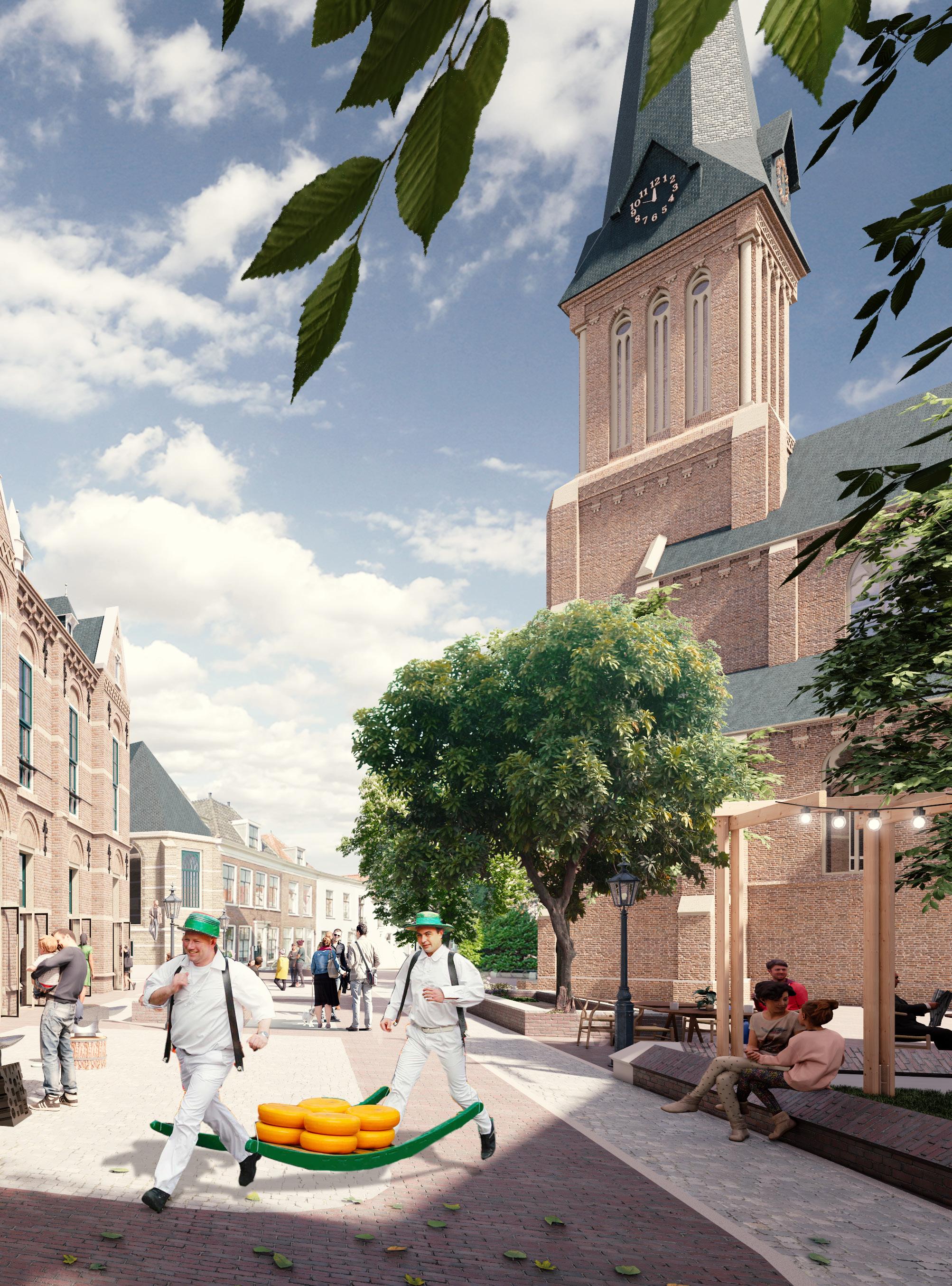 The layout of the new public space reminds of the pavilion layout. Pathways and spaces are still visible on the ground. Marking and reminding about the activities. The materials used are the same as the existing space to fit into the historic context. The cobblestones are taken from the existing street and the paving is matched to the existing building.