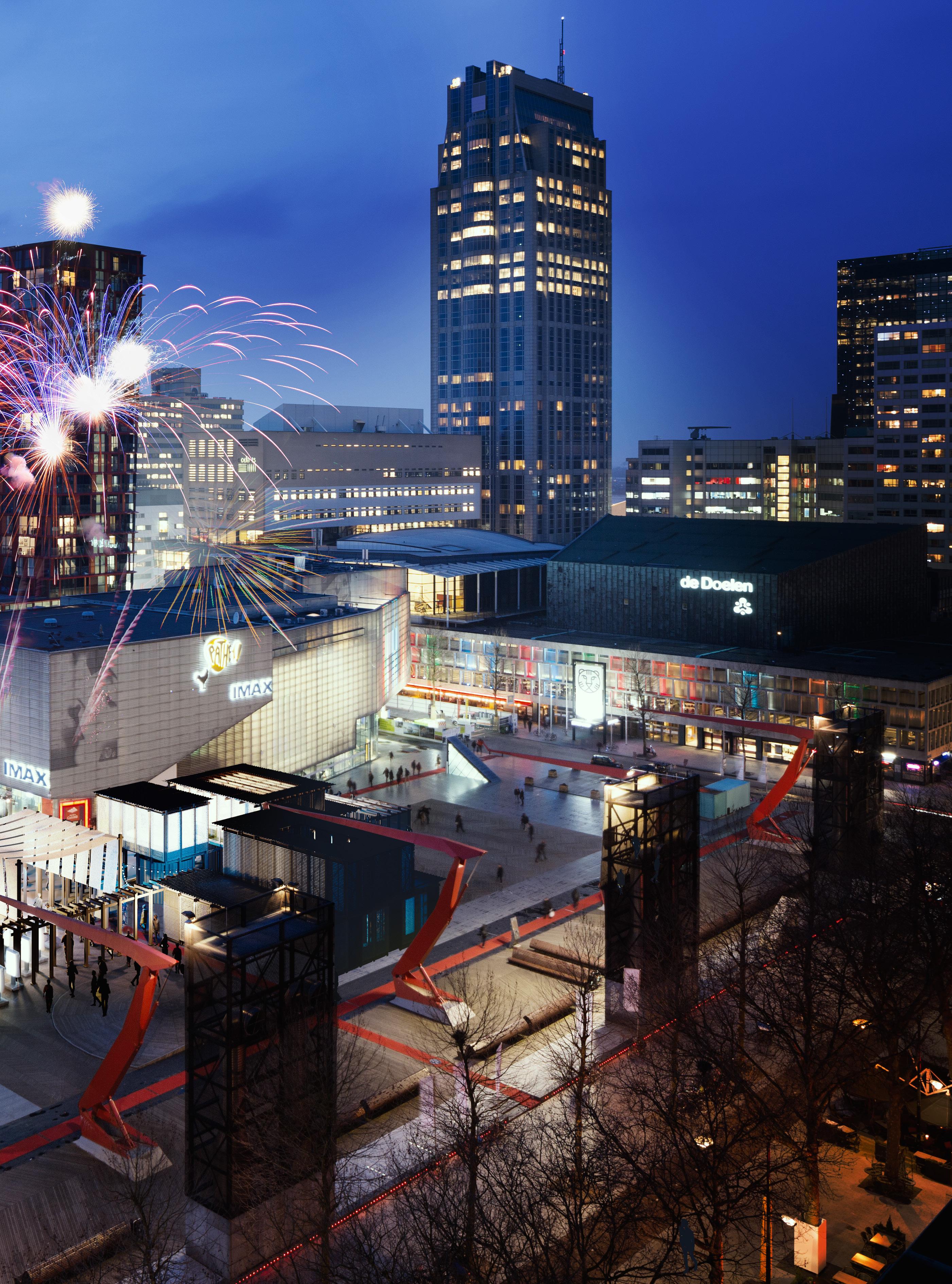 The pavilion frames empty space and make boundaries for activity. Around the Shouwburg square in Rotterdam is a lot of activity, the pavilion takes this activity and pulls it into the centre.