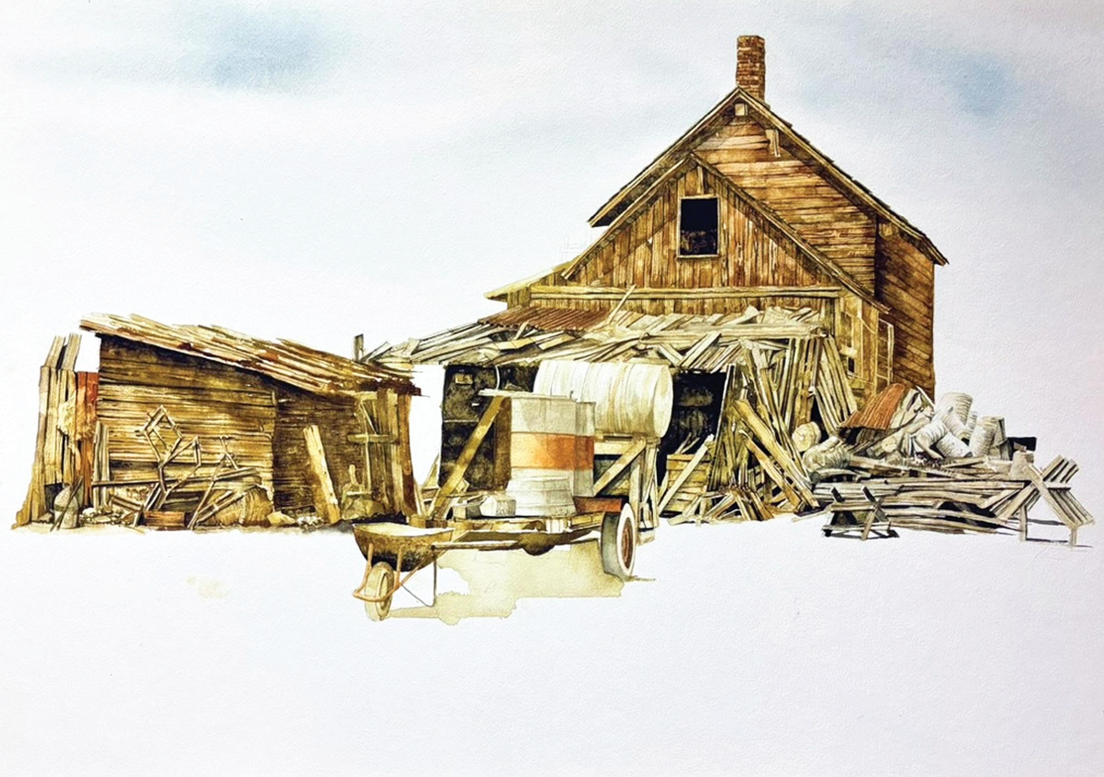 One of the ‘Magnificent Derelicts’ painted by Ron Woodall during his documentation of once-great Canadian farm buildings. The exhibit of his works at the Hearth runs through April 20.