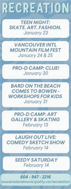 A two-day celebration of adventure, storytelling and the spirit of exploration. Come for Saturday, Sunday, or both Doors at 1:30 pm, films start at 3. More info on films and ticket details on Bowen Rec website.