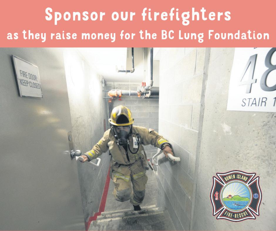 OnMarch1,2026,sixmembersofBowenIslandFireRescuewilltakepartin thisyear’sClimbtheWallfundraiserinsupportoftheBCLungFoundation. FirefightersfromcommunitiesacrossBritishColumbiaandbeyondwillclimb theSheratonVancouverWallCentretothe48thfloor,wearingfullturnoutgear andSCBA,toraisefundsforthiscriticalcause.