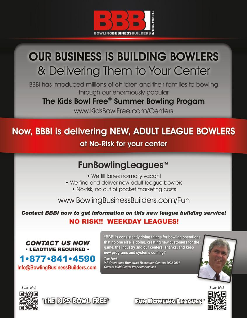 At BBBI our goal is to create new customers and profits for bowling centers through our time tested Kids Bowl Free Summer Bowing Program and our new League Development System featuring Fun Bowling Leagues for all ages.