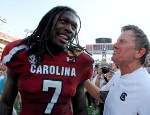 As a sophomore, the ferocious defensive end blossomed into a star and was a unanimous All-American. He led Steve Spurrier’s Gamecock defense that rolled to a 10-2 record but Michigan moved the ball well and led the Outback Bowl early in the fourth quarter, 22-21. With the Wolverines driving the ball again, running back Vincent Smith took a hand-off and before taking a step he was met by an unblocked, streaking Clowney. He hit the running back so hard that Smith’s helmet flew off as the ball hit the turf. Clowney grabbed the fumble as the stunned crowd of 54,527 at Raymond James Stadium looked on in awe.