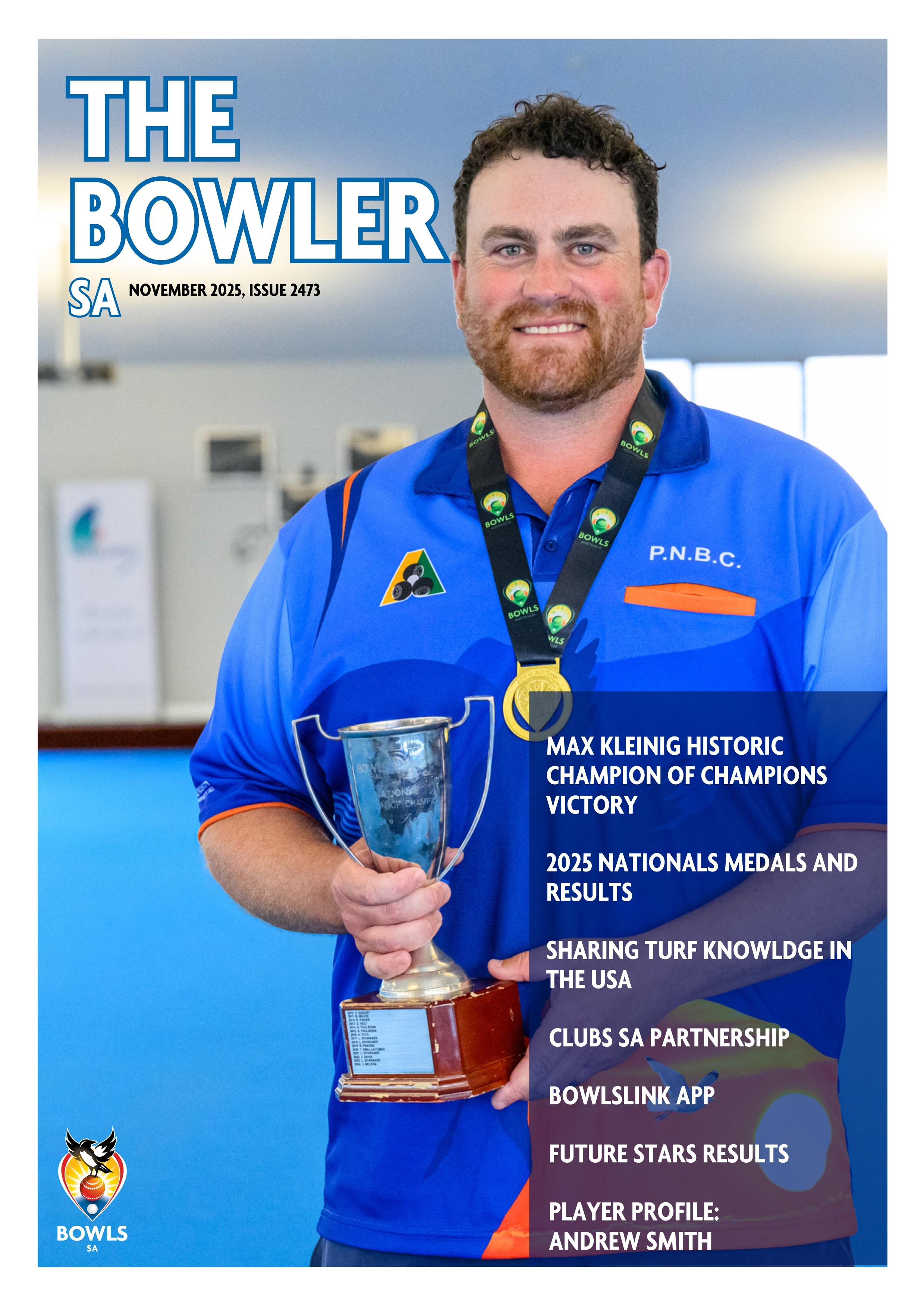 With this victory, Max Kleinig be comes the first South Australian to win the men’s Champion of Cham pions in ten years, following Scott Thulborn’s back-to-back titles in 2014 and 2015 — a historic mo ment for both him and SA bowls.