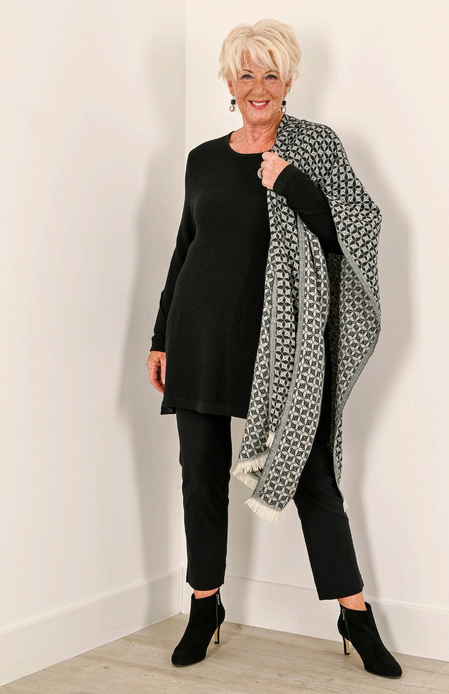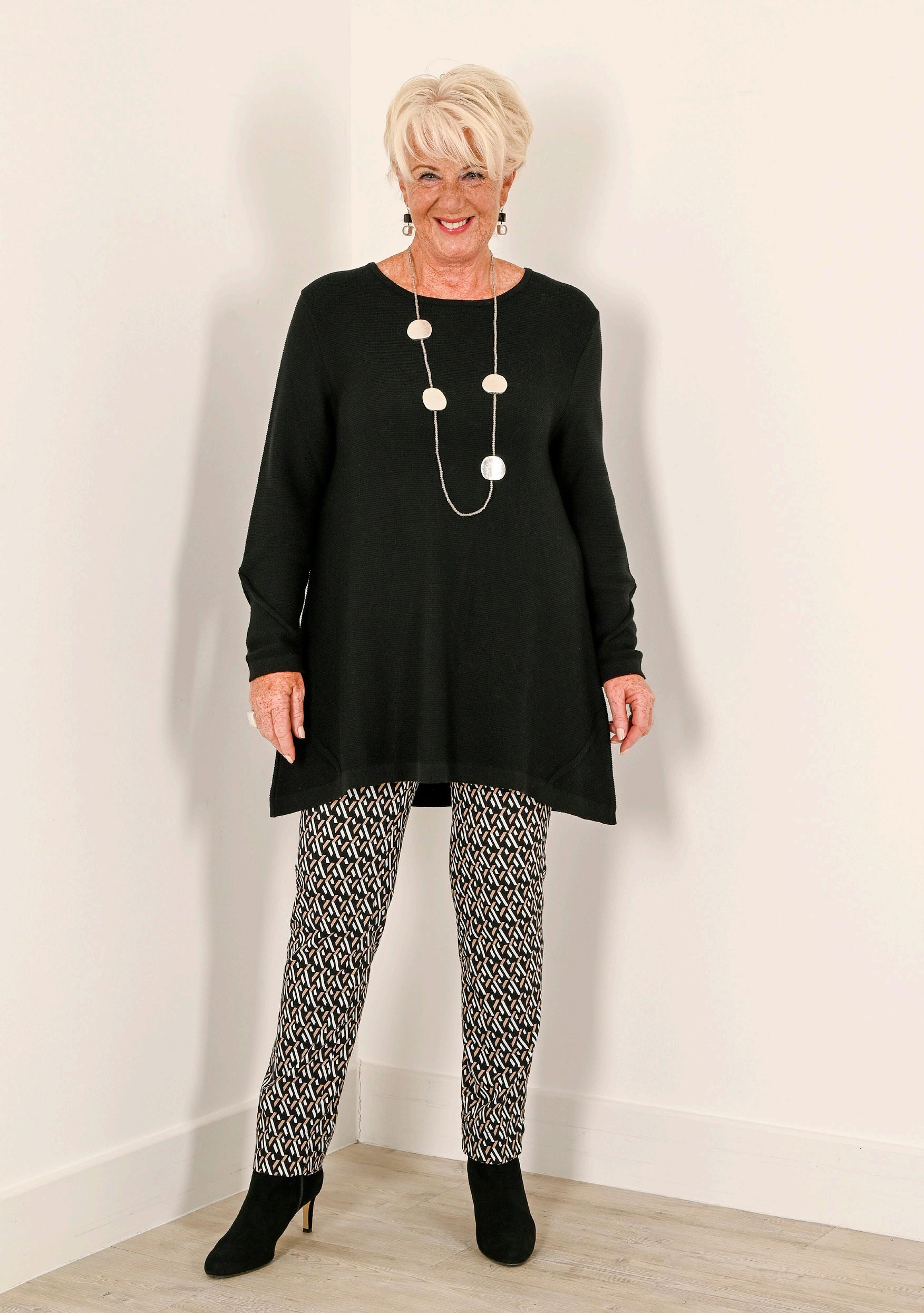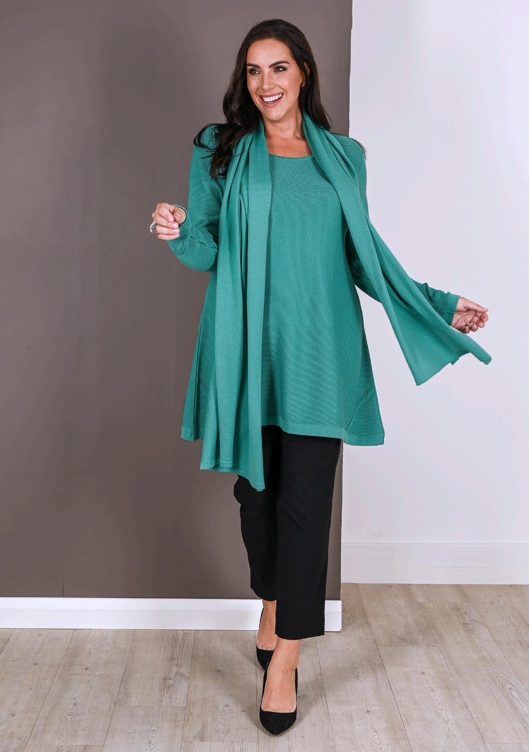 Veronica Knitted Jumper £60 teal Size 14/18, 20/24, 26/30 Print Scarf £15 green Marie ROBELL® Stretch Trouser £50 teal Size 14, 16, 18, 20, 22, 24, 26AUTUMN ICONS