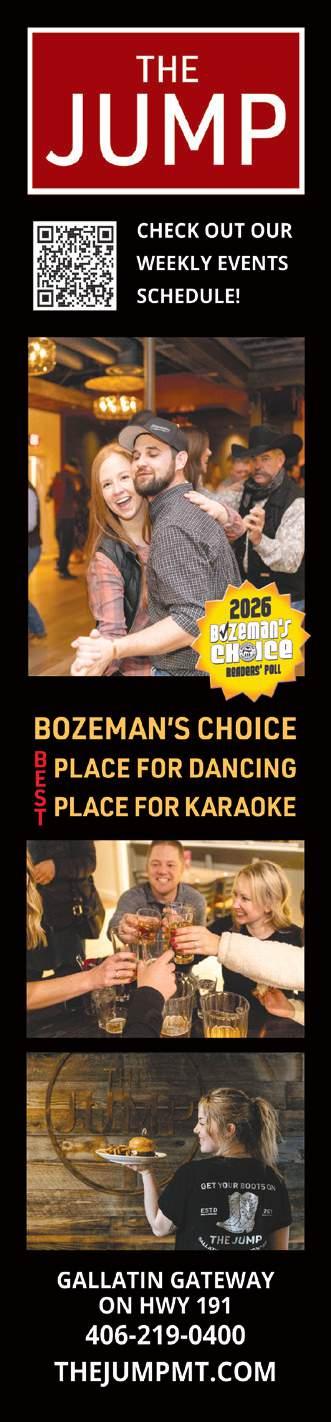 BRANDON HALE & THE DIRTY SHAME 8-11pm • The Jump, 75770 Gallatin Rd, Gallatin Gateway • FREE • 21+ • 4062190400 • thejumpmt.com Brandon Hale and The Dirty Shame bring a road-worn blend of outlaw country and raw Americana, shaped by backroom bars, busted jukeboxes, and long Montana nights. Raised on the rebel spirit of Waylon, Willie, Merle, and Hank Jr.