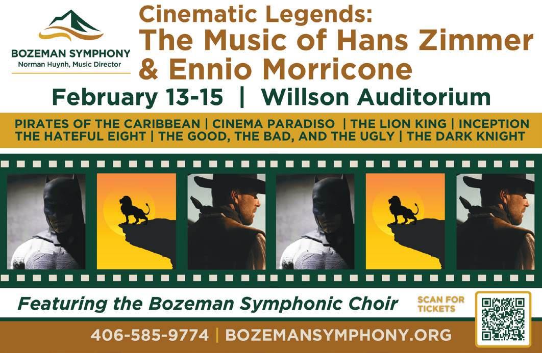 BOZEMAN SYMPHONY’S FREE COMMUNITY CONCERT 1-2pm • Willson Auditorium, 404 W. Main St., Bozeman • FREE • All Ages • 4065859774 • www.bozemansymphony.org The Bozeman Symphony presents its free Community Concert featuring Dan Brown’s Wild Symphony. The program is designed for children ages 5–12 and provides an engaging introduction to the orchestra.