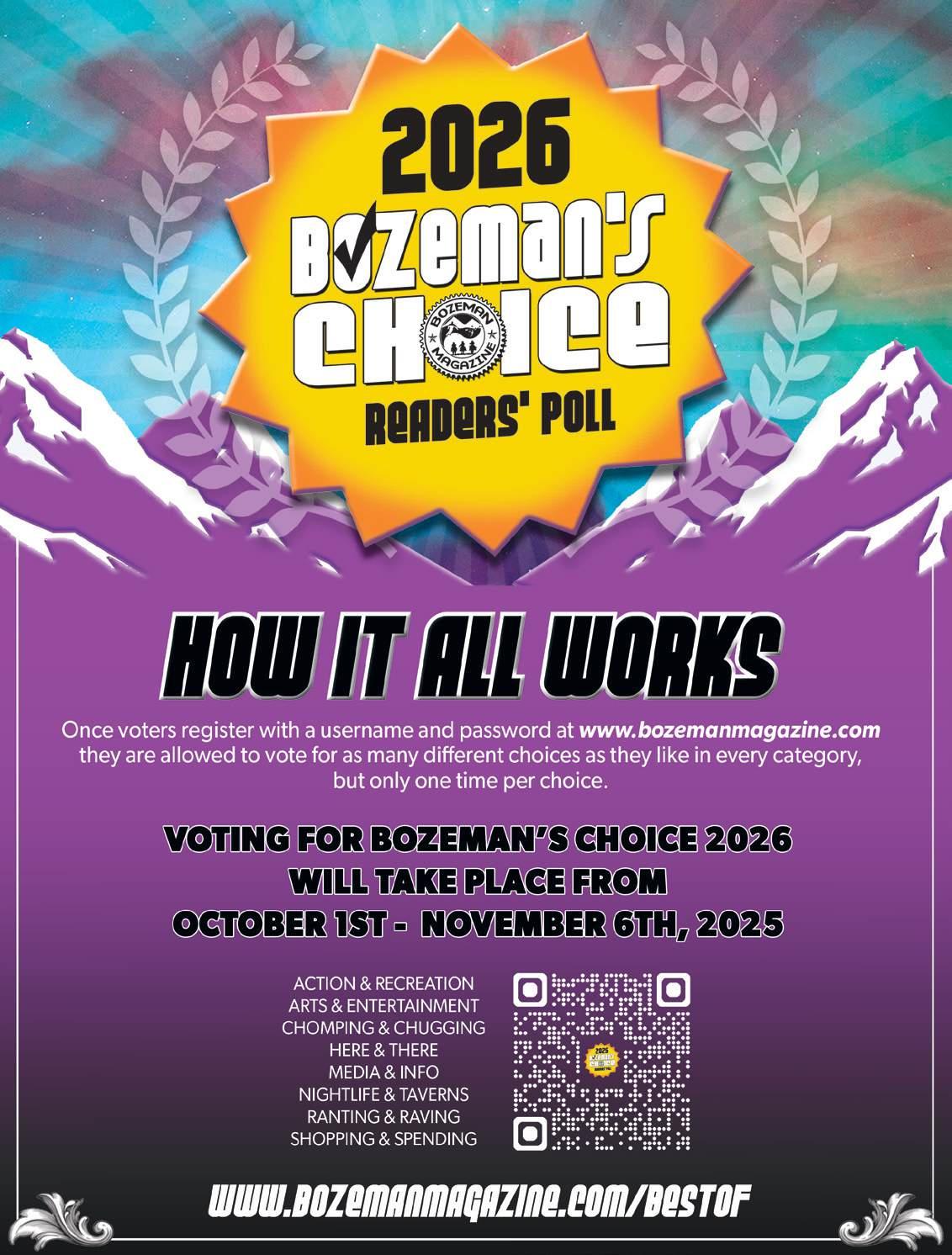 Please join in on putting your stamp of approval on all-things-Bozeman in the 11th annual Bozeman’s Choice Readers’ Poll—vote online October 1 - November 6, 2025 for the 2026 Awards, which will be announced on January 1, 2026. R