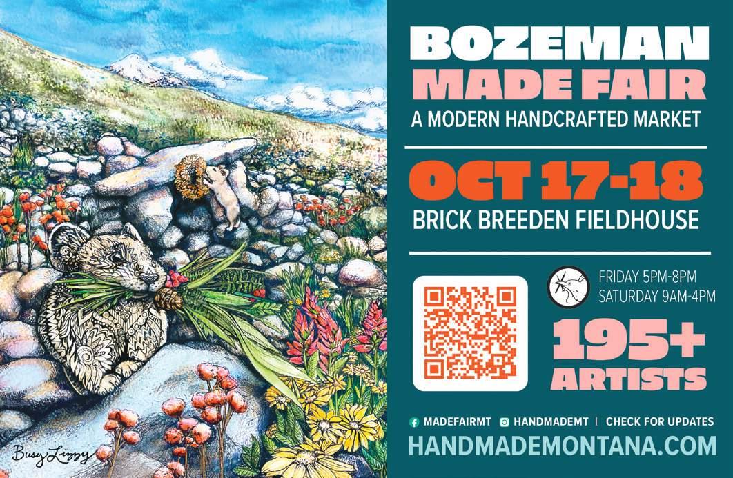 BOZEMAN FALL MADE FAIR 9am-4pm • Brick Breeden Fieldhouse, 1 Bobcat Circle, Bozeman • FRIDAY: $10 VIP 5 PM-8 PM SATURDAY : $5 EARLY BIRD 9AM-10AM; FREE ENTRY 10AM-4PM • All Ages • 4062149078 • www.handmademontana.com Enjoy shopping a curated collection of over 195+ skilled artisans and non-profits. There is something for everyone from affordable functional art to heirloom fine art pieces. VIP & Early Bird Pass proceeds benefit Gallatin Watershed Council.
