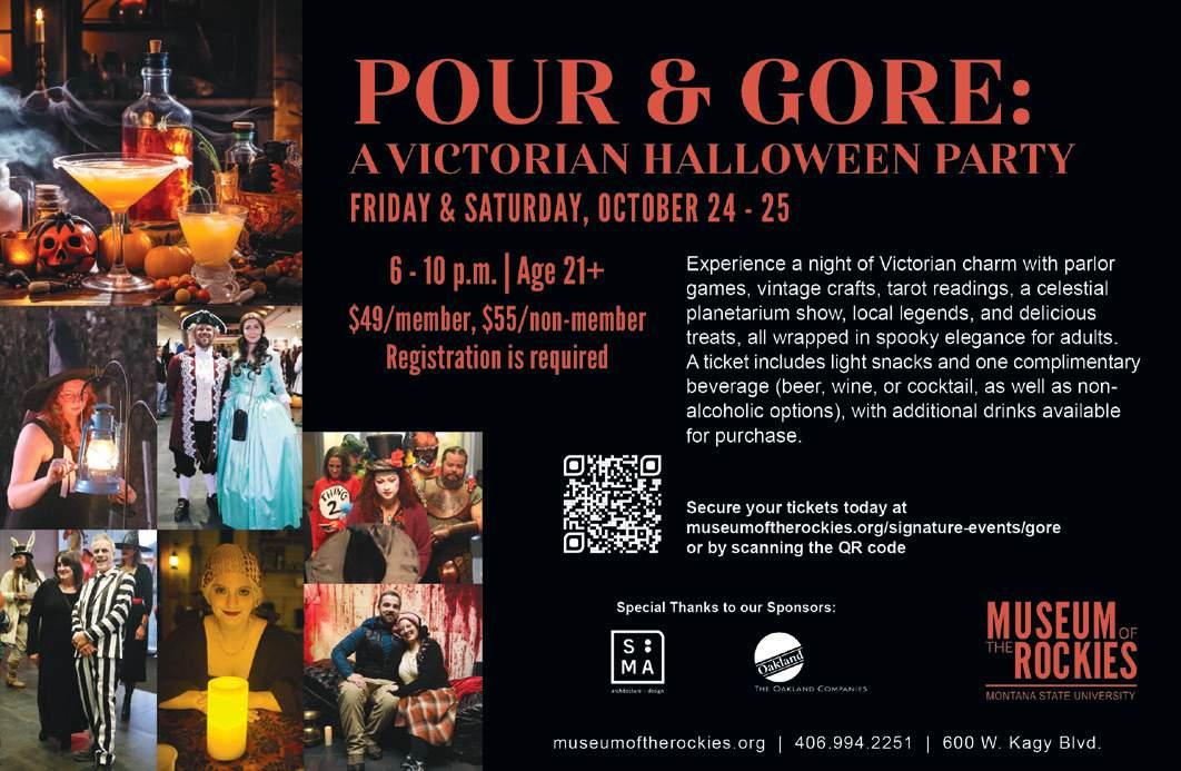 POUR & GORE: A VICTORIAN HALLOWEEN PARTY 6-10pm • Museum of the Rockies, 600 West Kagy Boulevard, Bozeman • $49/member, $55/non-member • 21+ • 4069942251 • museumoftherockies.org Step into eerie elegance at Pour and Gore, the ultimate Halloween soirée for adults! Slip into your finest vintage threads and uncover the shadowy secrets of the Victorian era at this delightfully dark and immersive evening of spirited fun.