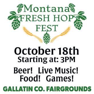 MONTANA FRESH HOP FESTIVAL! 3-8pm • Gallatin County Fairgrounds, 901 N. Black, Bozeman • $25 • 21+ • (406) 582-3270 • www.eventbrite.com This unique style of beer is a true seasonal, only available each year during Hop Harvest! $25 gets you entry into the Festival, a commemorative tasting glass, and unlimited samples of delicious Montana brews from over 30 breweries!