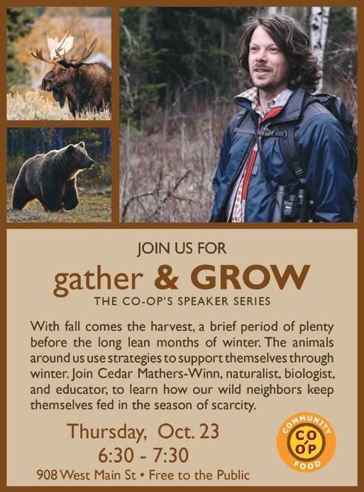 GATHER & GROW: HOW ANIMALS WEATHER THE WINTER WITH CEDAR MATHERS-WINN 6:30-7:30pm • Bozeman Community Food Co-op, West Main • FREE • All Ages • 4065871919 • www.bozo.coop The animals around us use their own strategies to support themselves through lean, long winters. Join Cedar Mathers-Winn, naturalist, biologist, and educator, to learn how our wild neighbors keep themselves fed in the season of scarcity.
