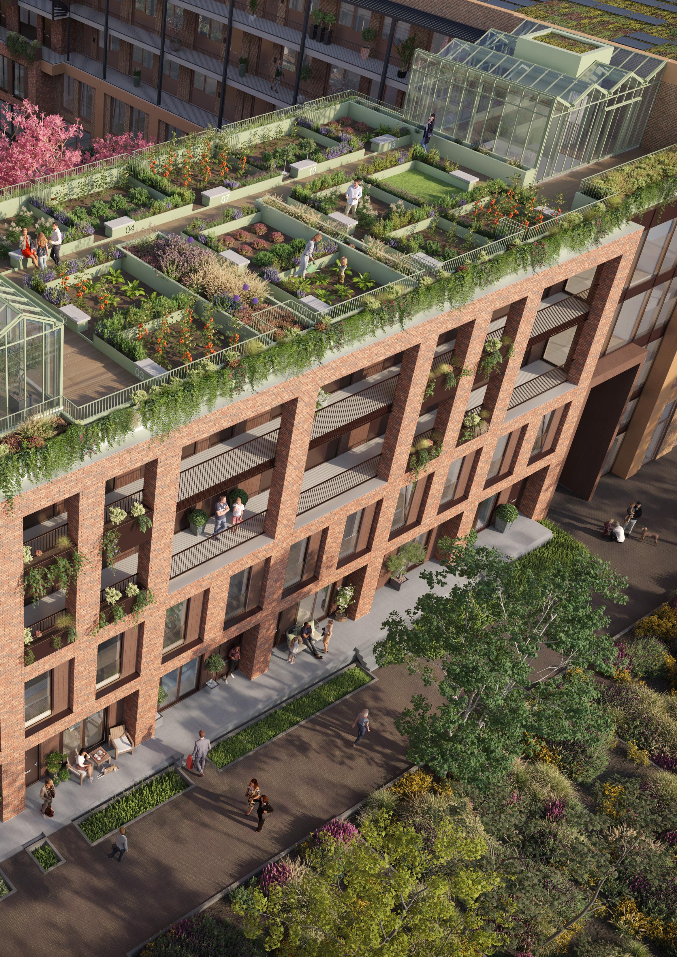 Sarah: ‘De buurt krijgt heel veel groen en plekken voor de bewoners om elkaar te ontmoeten. Daarbij krijgen alle woningen ook fijne buitenruimtes, tot en met collectieve daktuinen aan toe. Zo ontstaat echt een community-gevoel: je woont hier met elkaar. Met de architectuur hebben we daar ook op aangesloten. We hebben heel goed gekeken: hoe staan de woningen straks naast elkaar, hoe verlopen de overgangen? Met de keuze voor de materialen speelden we daarop in. Het heeft een bijna on-Nederlandse uitstraling: met veel reliëf en diepte.’