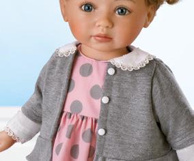 Der feine Pinselstrich der Handkoloration erweckt das süße Gesicht zu wundervollem Leben. Maßgeschneidertes Out t aus einem rosafarbenen Kleid, einem grauen Cardigan mit Spitzenbesatz und einem Paar Mary-Jane-Schuhe. Dank der einmaligen Hold that Pose™-Technologie können Sie den goldgelockten Schatz so ausstellen, wie Sie möchten. Und wollen Sie etwas Neues ausprobieren, dann behält „Svenja“ jede Pose, die Sie ihr geben! Größe: 56 cm. Artikel-Nr.: 03-02752-001 • € 199,80 (zahlbar auch in 4 Monatsraten zu je € 49,95) zzgl. € 14,90 Versand