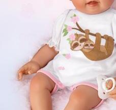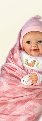 Aus dem einzigartigen RealTouch®-Vinyl handgefertigt. Durch das natürliche Gewicht ist das Tragegefühl ähnlich wie bei einem Baby. Fühlen Sie nicht nur die lebensechte Haut, sondern spüren Sie auch das realistische Gewicht, wenn Sie „Dani“ sanft in Ihren Armen wiegen. Die feinen Haare sind von Hand verwurzelt. Mit maßgeschneidertem Ensemble, aus einem kuscheligen Schlafanzug mit Fäustlingen sowie einem dazu passenden Mützchen. Inklusive rosa Decke mit Tarnmuster. Größe: 43,2 cm. Artikel-Nr.: 03-03191-001 • € 169,80 (zahlbar auch in 4 Monatsraten zu je € 42,45) zzgl. € 9,95 Versand