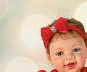 Die kleine „Gianna“ wird von Hand aus RealTouch®-Vinyl, welches zarte Babyhaut lebensecht nachemp ndet, gefertigt. Die kunstvoll gestalteten Gesichtszüge sind von Hand koloriert und jedes kleinste plastische Detail ist realistisch abgebildet. Der weiche Sto körper besitzt ein lebensnahes Gewicht und schmiegt sich angenehm in Ihre Arme. Die feinen Haare sind von Hand verwurzelt. Ihr Kopf und ihre Gliedmaßen sind beweglich, so dass Sie „Gianna“ nach Belieben in Szene setzen und das perfekte Weihnachtsfoto machen können. „Gianna“ trägt ein luxuriöses, rotes Satinkleid mit roter Spitze an der Passe und den Ärmeln sowie Spitzenbesatz an den Rocksäumen. Die überdimensionale Schleife an ihrem Kleid wird mit einem funkelnden, silbernen Kunstedelsteinbesatz geschlossen, während ihre Haarsträhnen durch ein passendes, rotes Stirnband an Ort und Stelle gehalten werden. Rote Satinschühchen und eine weiße Strumpfhose komplettieren das elegante Out t. Und natürlich darf auch ihr hübscher silberfarbener Weihnachtsschmuck mit Schmucksteinen, Metallband und Platz für ein eigenes Foto nicht fehlen. Das Accessoire kann von „Gianna“ gehalten oder an den Baum gehängt werden. Größe: 43,2 cm. Ornamentgröße: 12,7 x 8,3 cm (B x H). Artikel-Nr.: 03-03282-001 • € 149,85 (zahlbar auch in 3 Monatsraten zu je € 49,95) zzgl. € 9,95 Versand