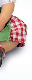 Monika Levenigs Puppenkreation ist wie gescha en für den herzerwärmenden Trachtenstil. „Resi“ kommt mit aufwendig geschneidertem Dirndl, einer bestickten Schürze und einer schicken Bluse zu Ihnen nach Hause. Die Puppe ist absolut lebensecht aus geruchsfreiem Vinyl von Hand gefertigt und mit feinem Pinselstrich von Hand koloriert. Der weiche und bewegliche Sto körper erlaubt sitzende oder liegende Posen. Ein absoluter Hingucker sind die blonden Haare aus Faux-Mohair mit dem süßen Zöpfchen und dem niedlichen Blumenhaarreif. Die Sto brezel sowie die hübschen Babyschuhe runden das Out t perfekt ab. Größe liegend 56 cm, sitzend 35 cm hoch, Kleidergröße 56 Artikel-Nr.: 722-SUP08.01 • € 179,80 (zahlbar auch in 4 Monatsraten zu je € 44,95) zzgl. € 14,90 Versand