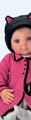 Handgefertigt aus RealTouch®-Vinyl, fühlt sich „Elles“ Haut wunderbar lebensecht an und duftet nach frischem Babypuder. Weitere Details sind die feine Handkoloration, die handverwurzelten Haare sowie das lebensnahe Gewicht. Abgerundet wird das Ensemble durch den maßgeschneiderten Strampler und „Elmar“, den großen PlüschElefanten. Elle ist 40,6 cm groß; Elmar ist 51 cm lang Artikel-Nr.: 03-02975-001 • € 169,80 (zahlbar auch in 4 Monatsraten zu je € 42,45) zzgl. € 9,95 Versand