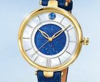 De edelstalen kast van het horloge is op de voorkant van een goudkleurige ionenplattering voorzien. De wijzerplaat is in een buitenring van parelmoer en een centrum van lapis lazuli verdeeld. Op twaalf uur is een blauw glanzende kunststeen geplaatst. En ook de armband straalt in het blauw van spijkerstof, waarmee deze overtrokken is. Diameter: 3,2 cm. Polsomvang: 16–20 cm Artikel-Nr.: 01-25445-001 • € 99,90 (ook betaalbaar in 2 maandtermijnen à € 49,95) plus € 8,95 verzendkosten