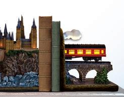 Deze handgemaakte en o cieel gelicenseerde collectie, elk bestaande uit 2 sets van 2 stevige boekensteunen en een uniek middenstuk, bootst de Zweinsteinexpress na op weg naar school. Elk individueel stuk is meesterlijk met de hand gemodelleerd uit gegoten beeldhouwwerk en artistiek met de hand gekleurd. Bovendien lichten alle onderdelen op met gele LED’s en geven ze je planken een magische gloed.
