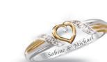 Der Ring ist aus 925er Sterling-Silber von Hand gefertigt. Seine zwei übereinander verlaufenden Bänder schließen jeweils mit einem PavéZwillingsband, besetzt mit glitzernden Diamanten. Im Zentrum funkelt ein echter Solitär-Diamant inmitten eines o en gestalteten Herzens. Das Herz und eines der beiden Ringbänder ist kostbar mit Gold plattiert. Verleihen Sie diesem prächtigen Schmuckstück noch eine individuelle Note und lassen Sie zwei Namen Ihrer Wahl auf die Ringinnenseite gravieren. Bitte Größe und Namen auf dem Bestellschein eintragen (max. 10 Zeichen inkl. Leerzeichen und Bindestriche). So wird aus diesem Ring ein einzigartiges Geschenk Ihrer ewigen Liebe! Erhältliche Größen: 6–12