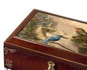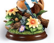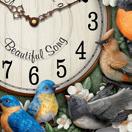 De wandklok bevat 12 kleurrijke zangvogels – allemaal met de hand gemodelleerd uit gegoten beeldhouwwerk en vervolgens levensecht met de hand ingekleurd. Elk uur hoor je het onmiskenbare gezang van de vogelsoort die op die plek zit. Beginnend met de rode kardinaal op 12 uur, zijn dit een krooneend, een boomklever, een tuin uiter, een cedarwaxwing, een junco, een roodkeelblauwborstje, een roodborstje, een pimpelmees, een pimpelmees en een distelvink.