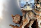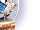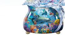 Een levendig kunstwerk van de onderwaterwereld door David Penfound siert de met de hand vervaardigde porseleinen sokkel van deze muzieksneeuwbol. Twee met de hand beschilderde dol jnen springen in het midden van de glazen bol. Indien gewenst licht de bol sfeervol op in roze, blauwe en gele kleuren. Het hoogwaardige muziekwerk speelt de melodie van “Beautiful dreamer”. Hoogte: 14,6 cm