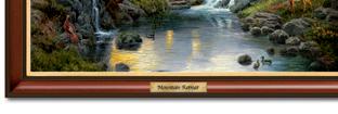 Das über einen halben Meter hohe Meisterwerk zeigt die Kunst der renommierten Tiermalerin Rosemary Millette, deren naturgetreue Darstellung von Hirschen im Morgennebel sorgfältig reproduziert und von Hand auf die Ober äche des bruchsicheren Spiegels aufgetragen wird. Der Rahmen aus Skulpturenguss ist von Hand gefertigt und in natürlichen Farben bemalt. Der Höhepunkt aber ist die Skulptur eines majestätischen Hirsches mit prächtigem Geweih, der aus dem Spiegel herauszutreten scheint. Streng limitiert auf 295 Fertigungstage. Mit Aufhängevorrichtung.