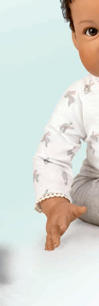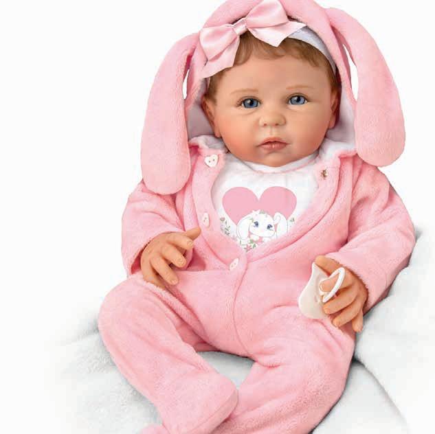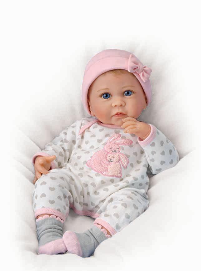 Handcrafted of RealTouch® vinyl and handpainted to highlight each feature, from her brown eyes to her rosy cheeks. She has a soft baby powder scent, and she is both poseable and weighted. Custom-designed outfit that features a white shirt with bunnies, designed to look like the photograph.