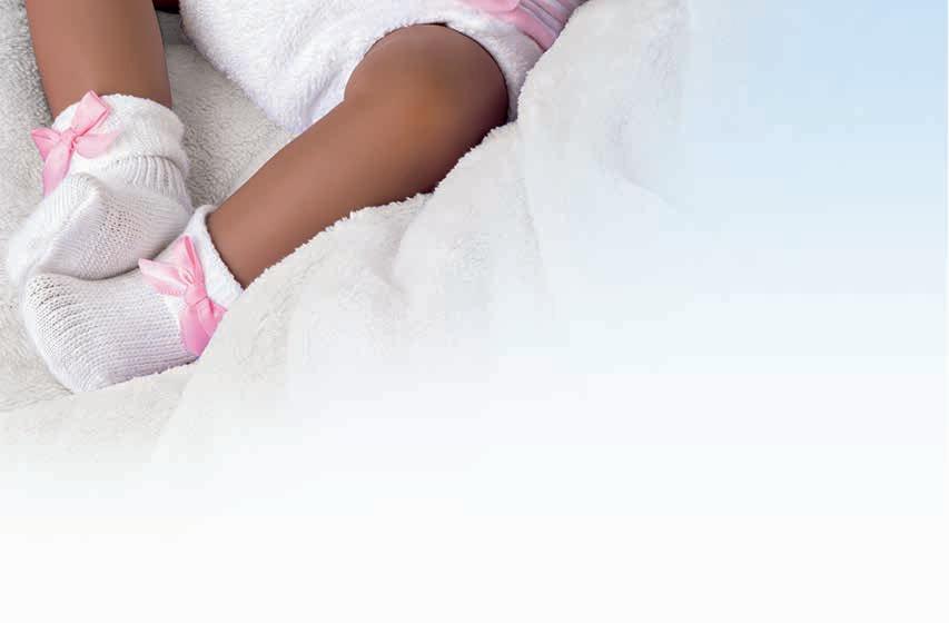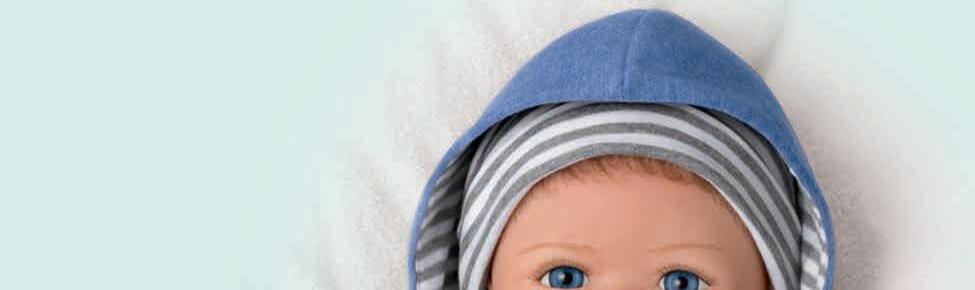Handcrafted from head to toe in our exclusive RealTouch® vinyl and handpainted to achieve the warm blush of new life. She is fully-poseable and weighted to feel like you’re holding a real baby. You’re sure to love her wispy, hand-applied hair and be charmed by her bright brown eyes filled with wonder. She comes snuggled in a soft purple fleece baby bunting with white bow to keep her comfy and warm. She arrives dressed in a pink one-piece outfit with ‘Baby Girl’ appliqué and hat, accented with colourful hearts. Item No. 03-02852-001