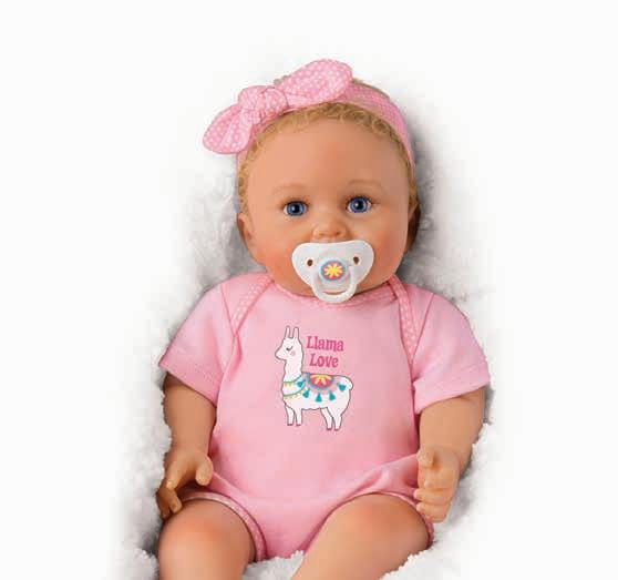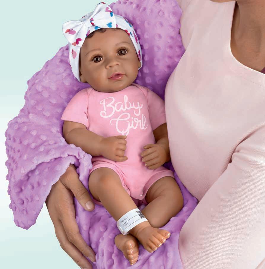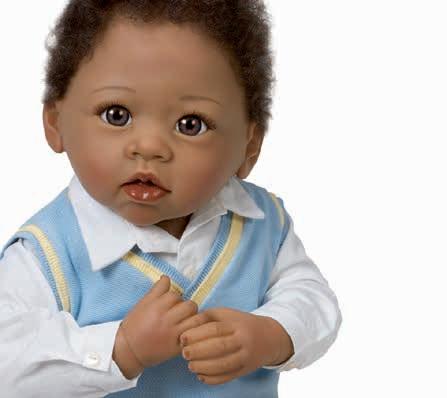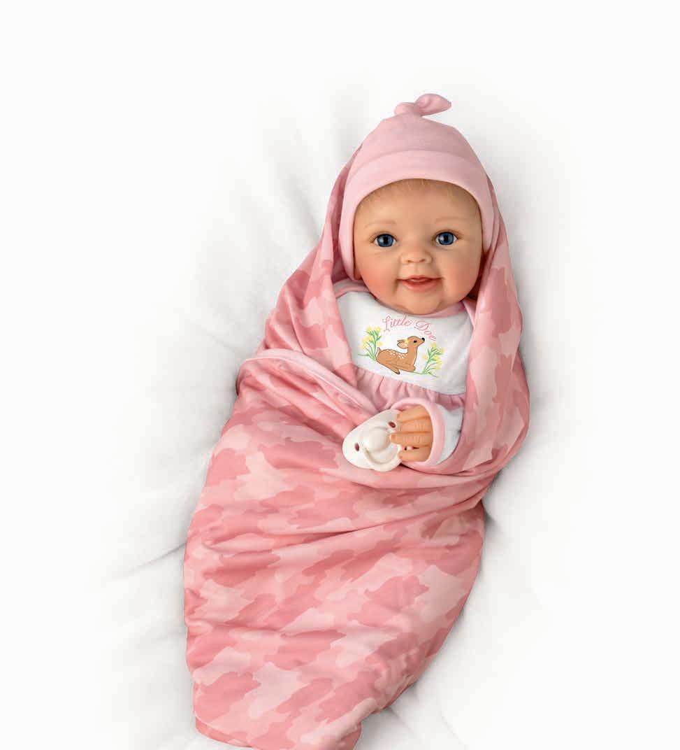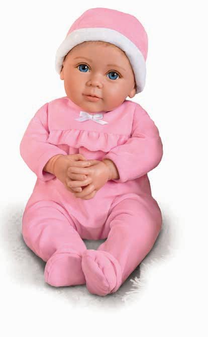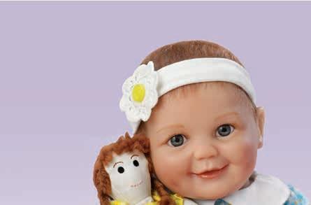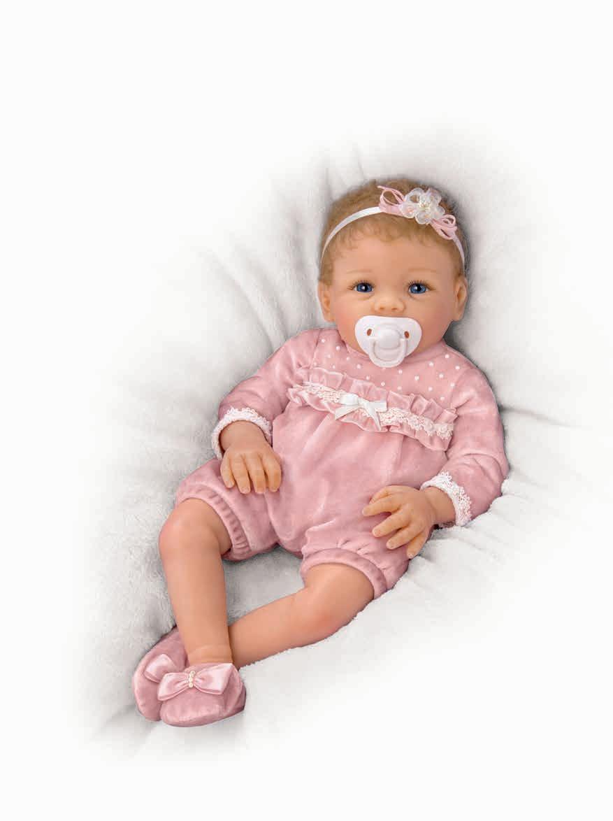 This baby doll is brought to life in our exclusive RealTouch® vinyl, from her tiny button nose to her lightly clenched hands and pudgy feet. Handpainted with loving care so that her skin has a warm glow, then add baby-fine wisps of pale blonde hand-rooted hair and tuck them under her pink stretch headband complete with a satiny bow.