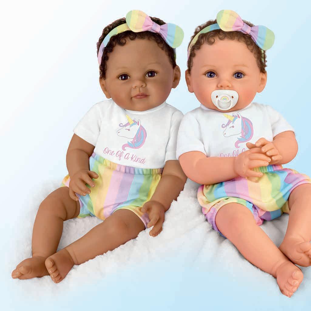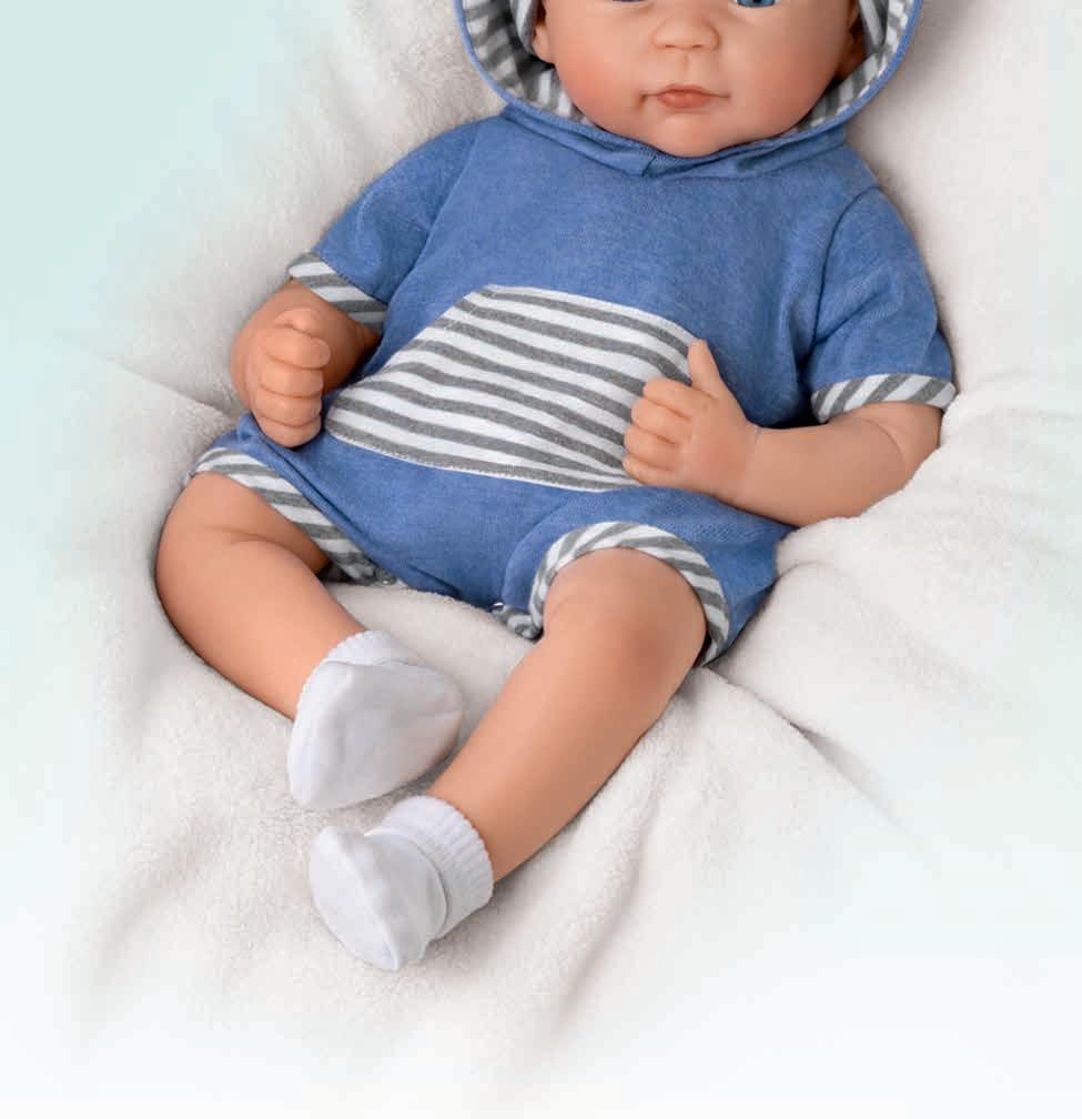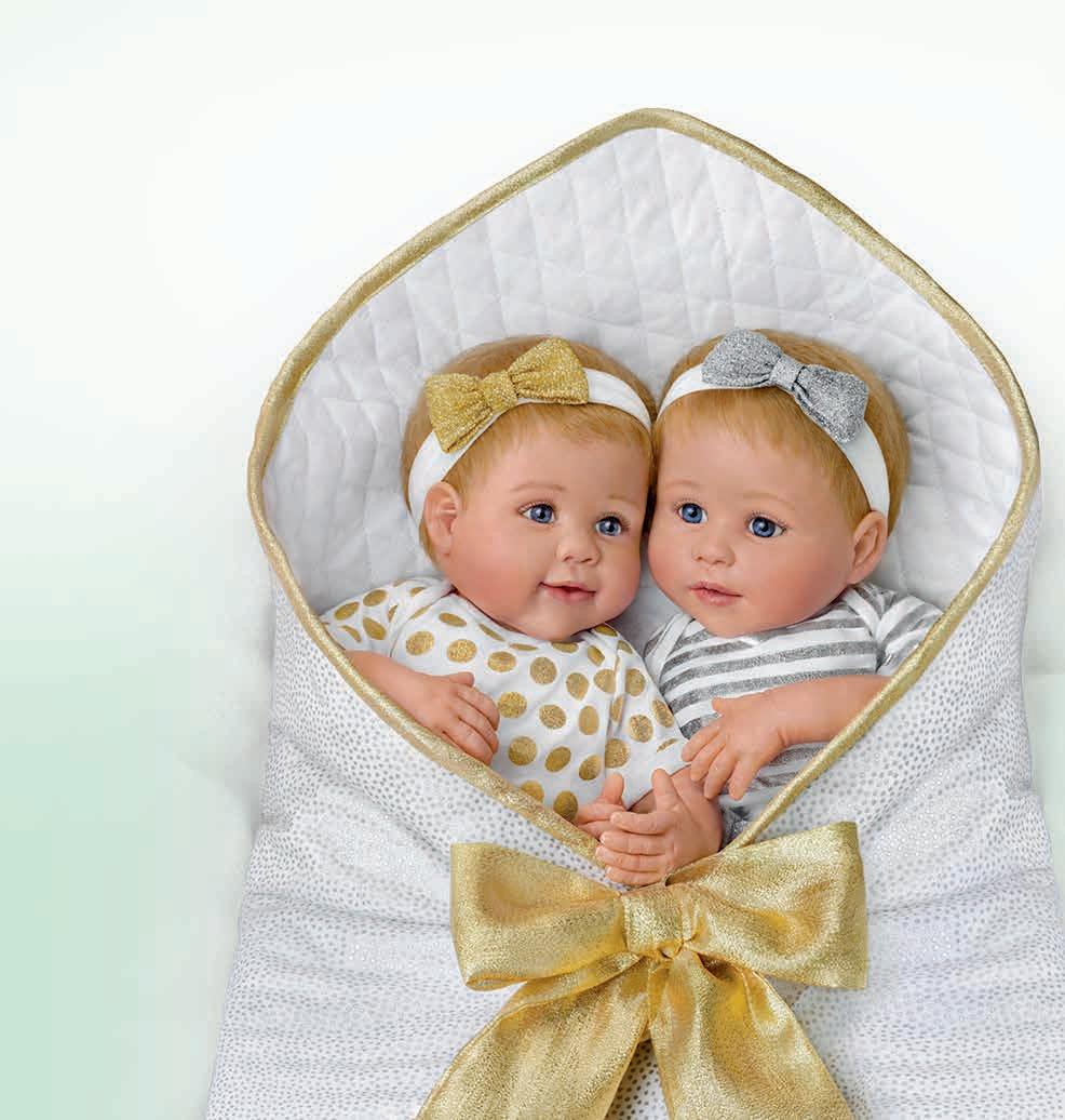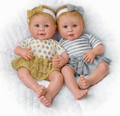 From their RealTouch® vinyl skin to thier wisps of hand-rooted hair, these little darlings are 17 inches and handpainted to achieve a realistic warm blush. Each arrives in a custom-designed knotted sleeper, with magnetic dummy. Their beanbag bodies are weighted to feel real, and they are poseable to fit perfectly in your arms.