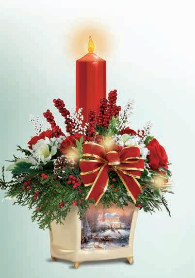 Handcrafted and trimmed with golden feet. Thomas Kinkade’s famed festive scenes are recreated in colour on each vase and LED lights are concealed inside the vases. Rising from each vase is a candle, including two tapers and one large pillar, in red – each topped with a golden longlasting LED light that looks like an illuminating ‘flame’. Hand-formed, everlasting Always in Bloom roses, assorted pine boughs, holly leaves and berries, and ten white lights, with hand-tied, real fabric bows.